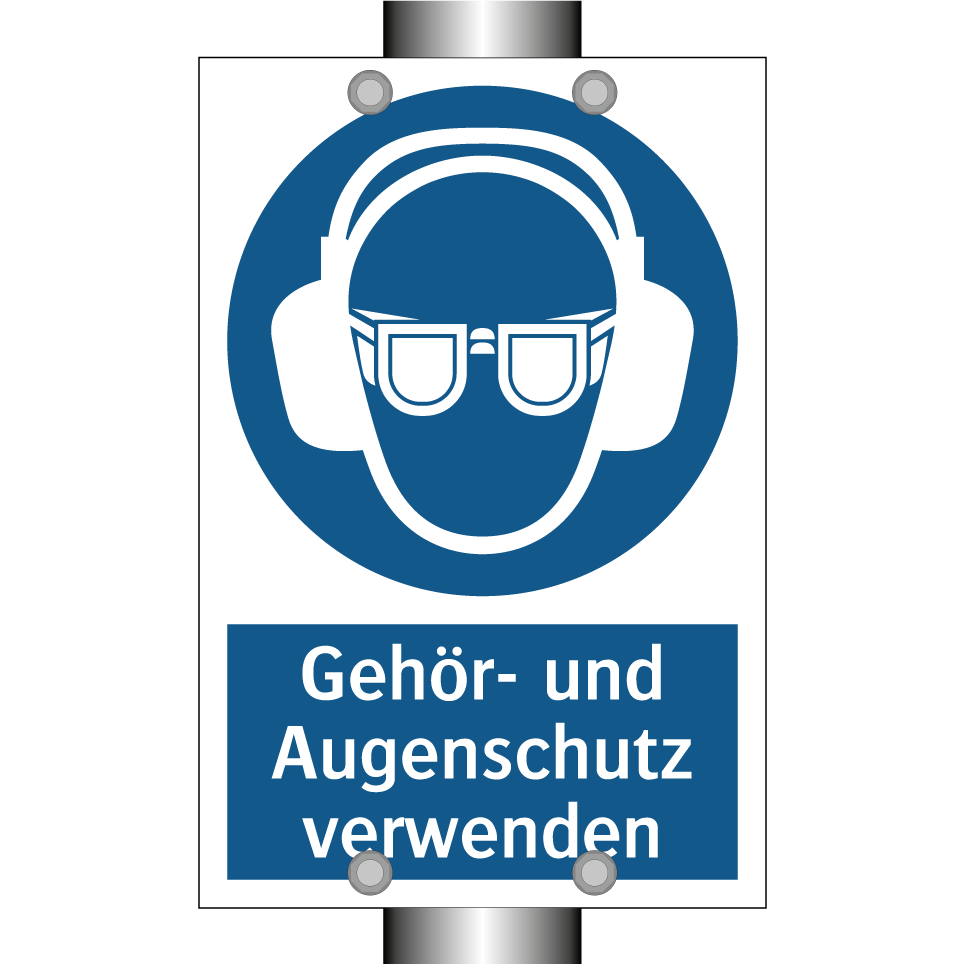 Gebotsschild mit dem Text Gehör- und Augenschutz verwenden