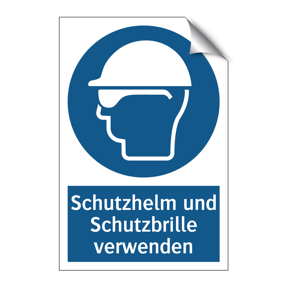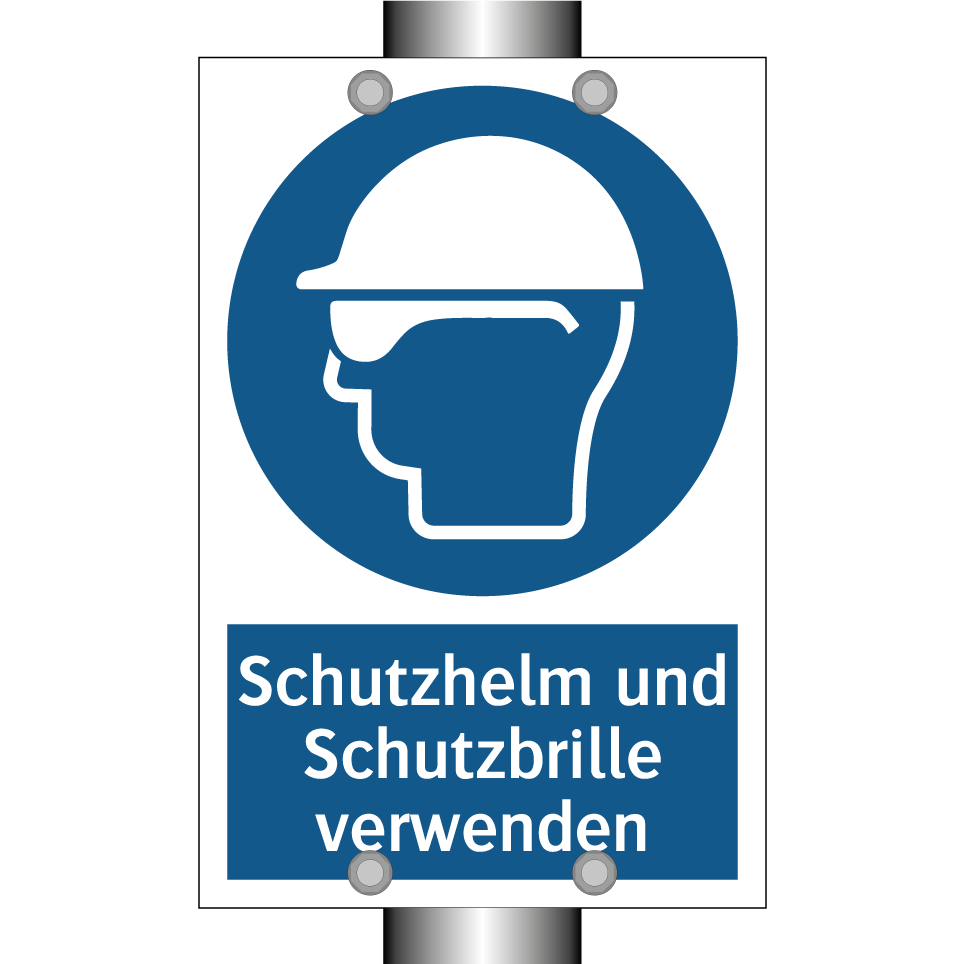 Gebotsschild mit dem Text Schutzhelm und Schutzbrille verwenden