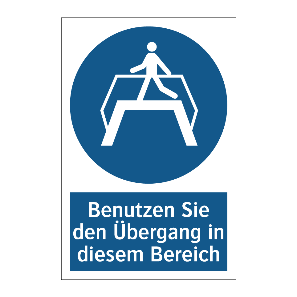 Diese Gebotsschild mit blauer Hintergrundfarbe und weißer Schrift ist ideal für die sichere Lenkung von Fußgängern in bestimmten Bereichen. Sie weist klar und deutlich darauf hin, dass der Übergang in diesem Bereich genutzt werden soll, um die Sicherheit zu gewährleisten. Diese Art von Schild ist besonders nützlich in stark frequentierten Zonen wie Fabriken, Lagerhäusern oder Baustellen, wo es wichtig ist, den Fußgängerverkehr zu regulieren. Auch in öffentlichen Einrichtungen wie Bahnhöfen oder Flughäfen kann diese Gebotsschild effektiv eingesetzt werden, um den Fluss der Menschenmengen zu steuern und Unfälle zu vermeiden.