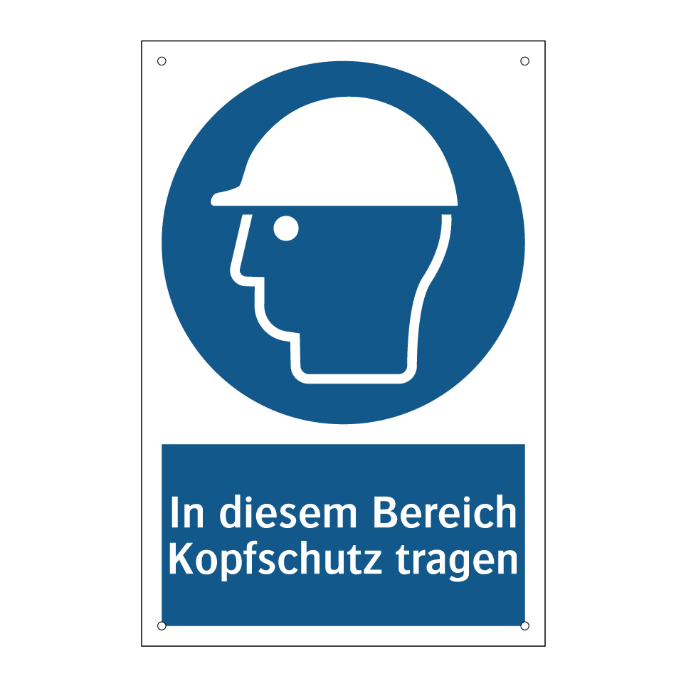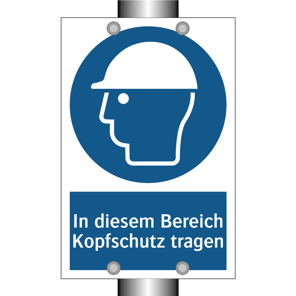Gebotsschild mit dem Text In diesem Bereich Kopfschutz tragen