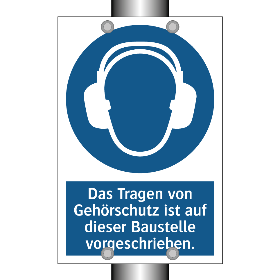 Gebotsschild mit dem Text Das Tragen von Gehörschutz ist auf dieser Baustelle vorgeschrieben.