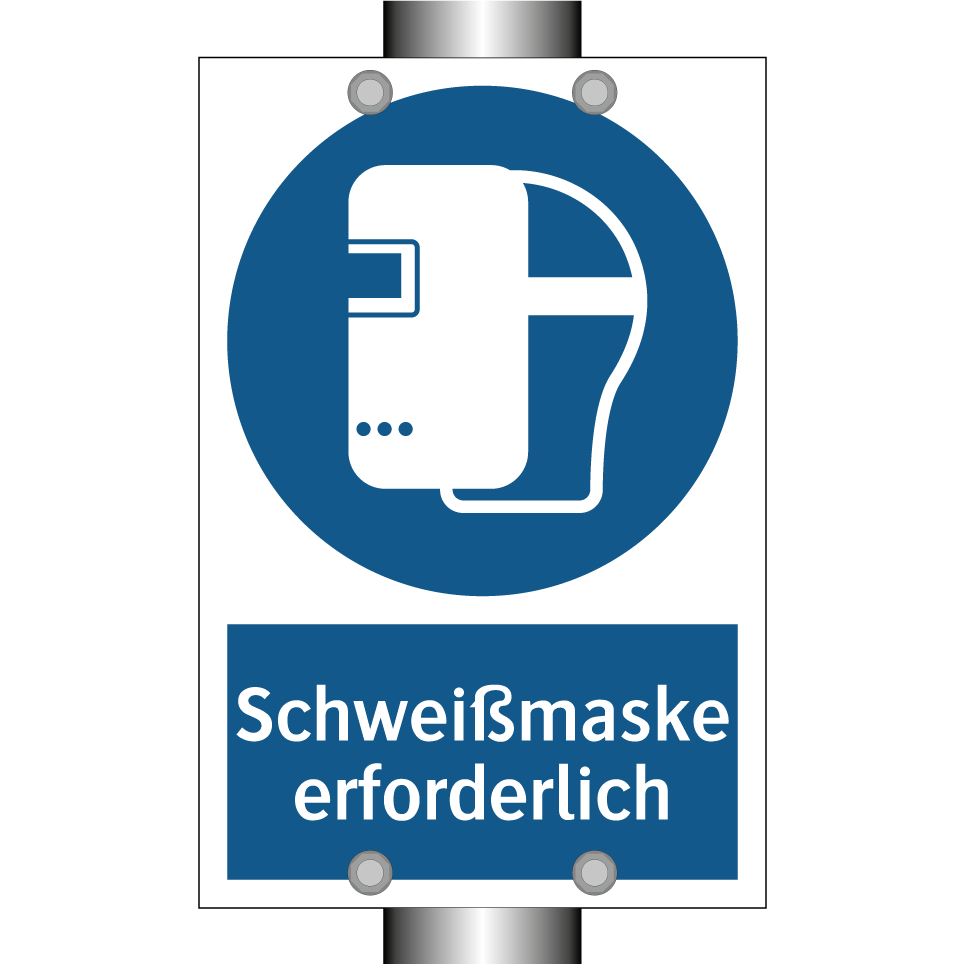 Gebotsschild mit dem Text Schweißmaske erforderlich