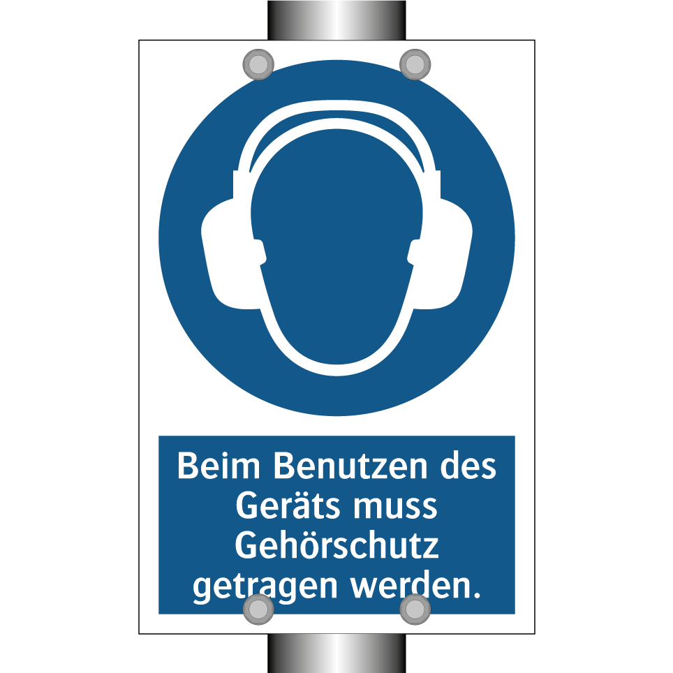 Gebotsschild mit dem Text Beim Benutzen des Geräts muss Gehörschutz getragen werden.