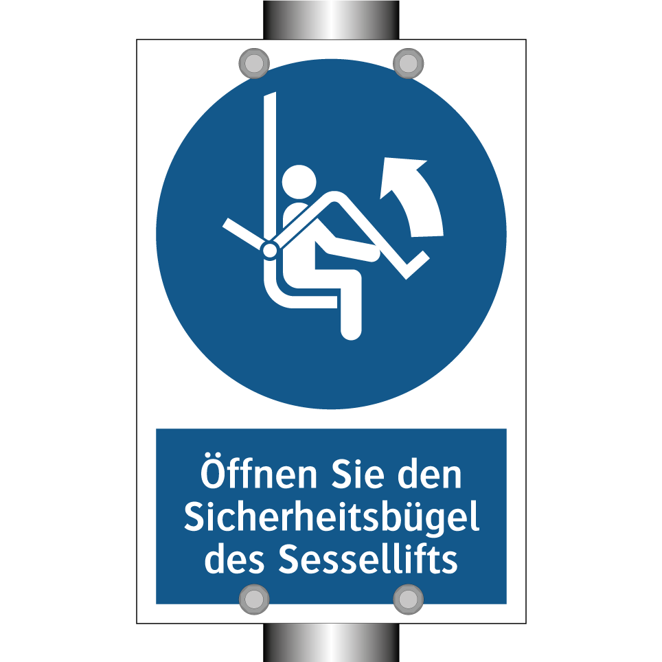 Gebotsschild mit dem Text Öffnen Sie den Sicherheitsbügel des Sessellifts