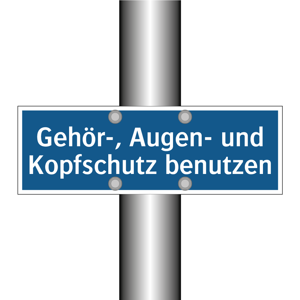 Gebotsschild mit dem Text Gehör-, Augen- und Kopfschutz benutzen