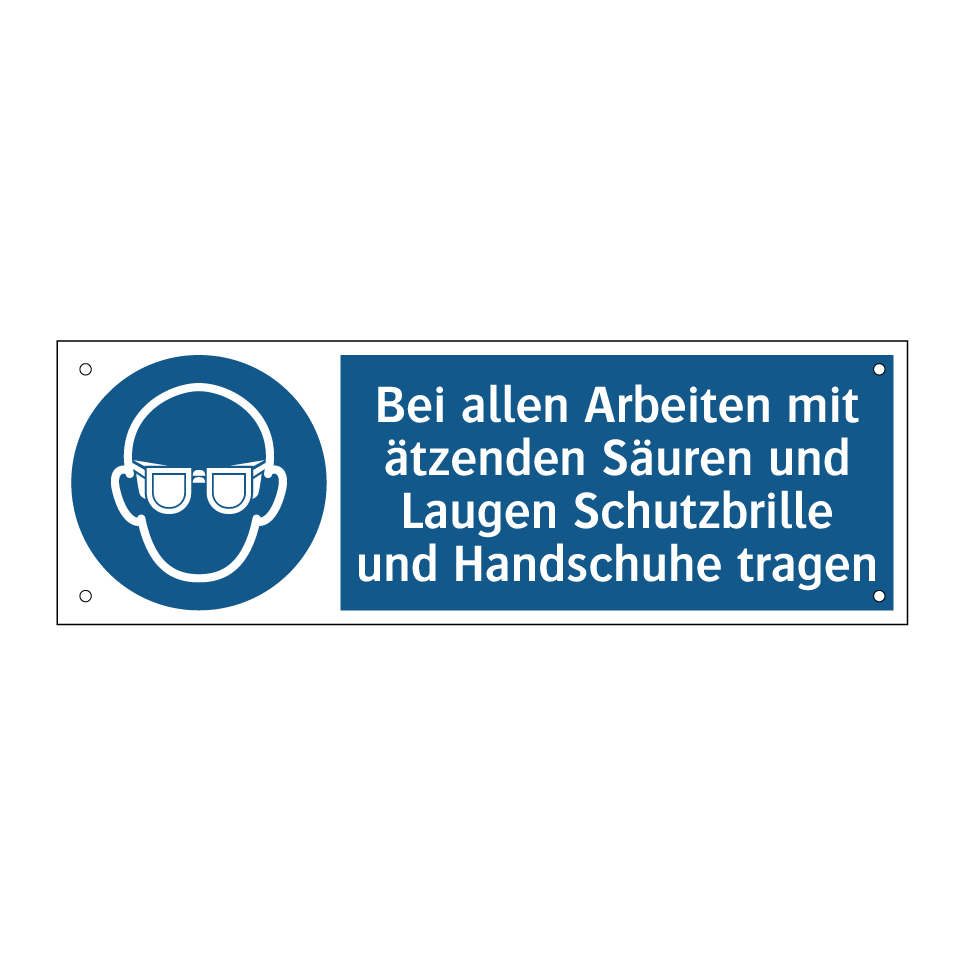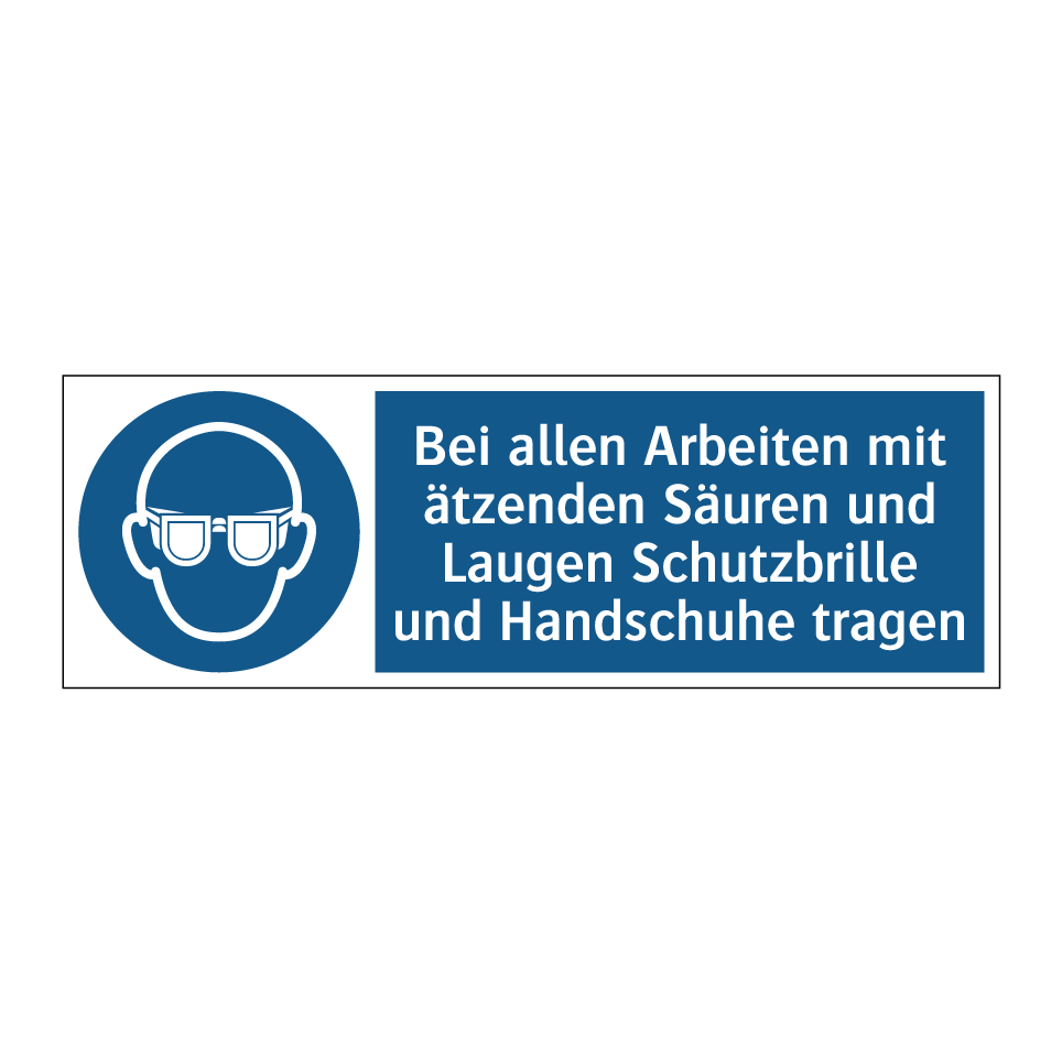 Gebotsschild mit dem Text Bei allen Arbeiten mit ätzenden Säuren und Laugen Schutzbrille und Handschuhe tragen