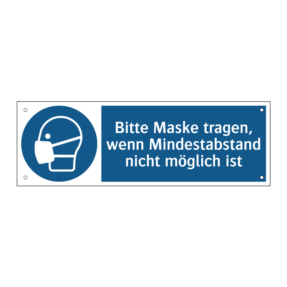 Gebotsschild mit dem Text Bitte Maske tragen, wenn Mindestabstand nicht möglich ist