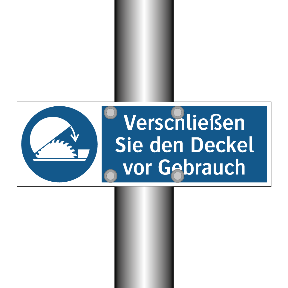 Gebotsschild mit dem Text Verschließen Sie den Deckel vor Gebrauch