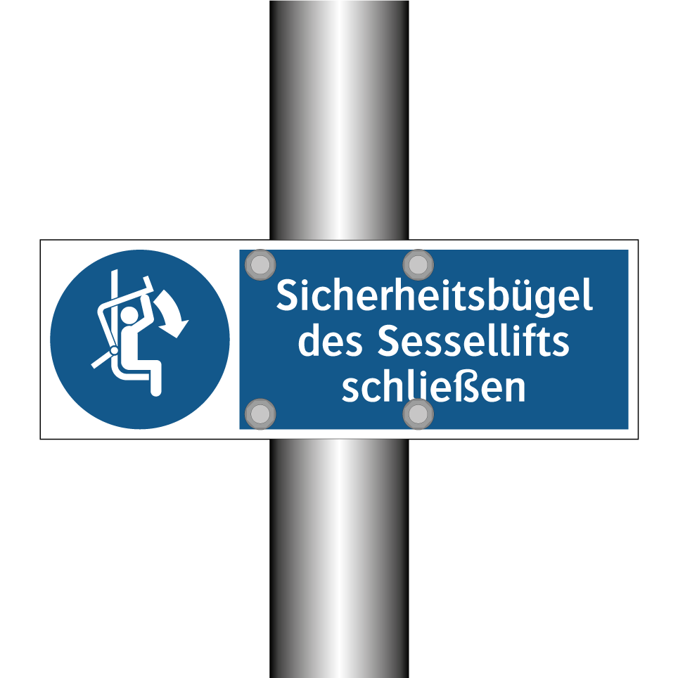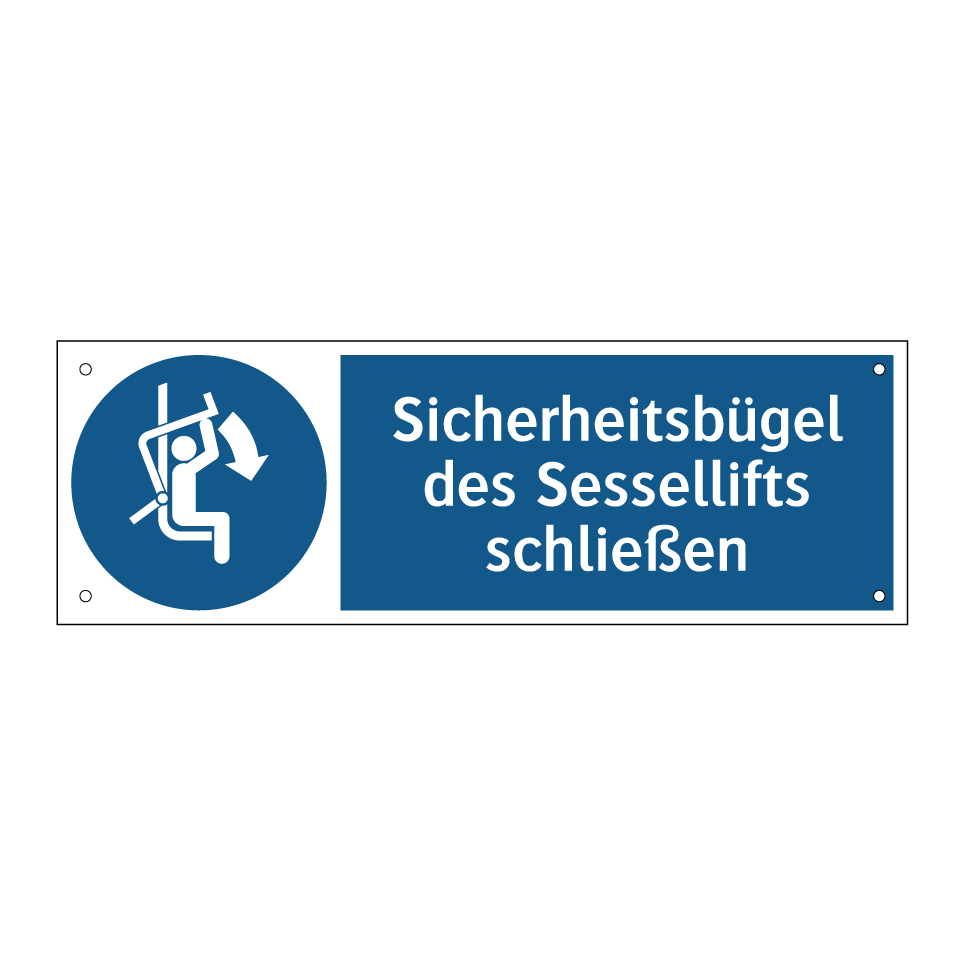 Gebotsschild mit dem Text Sicherheitsbügel des Sessellifts schließen
