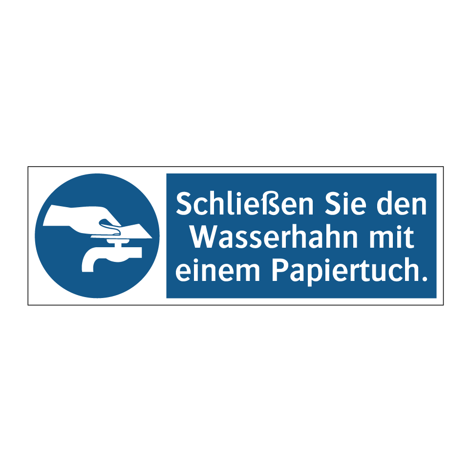 Gebotsschild mit dem Text Schließen Sie den Wasserhahn mit einem Papiertuch.