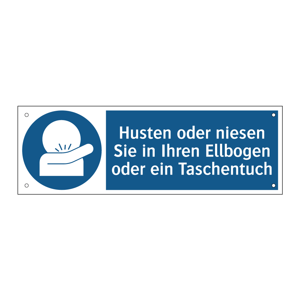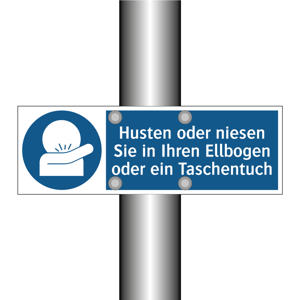 Gebotsschild mit dem Text Husten oder niesen Sie in Ihren Ellbogen oder ein Taschentuch