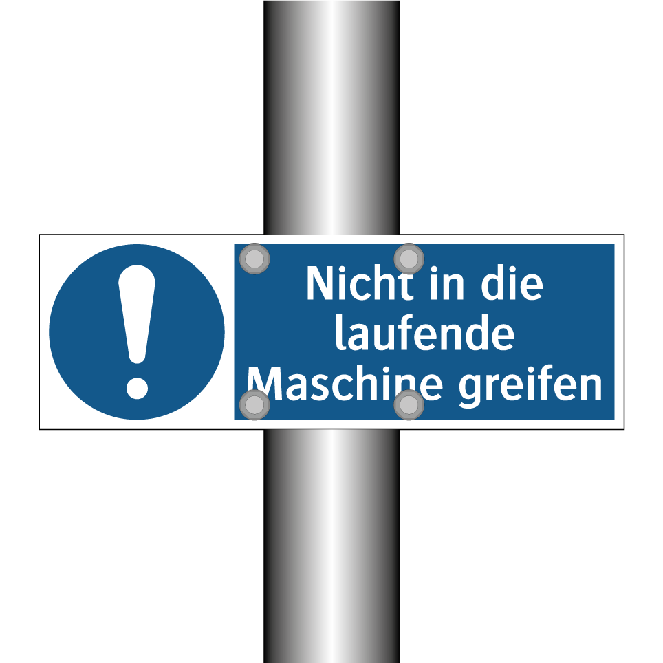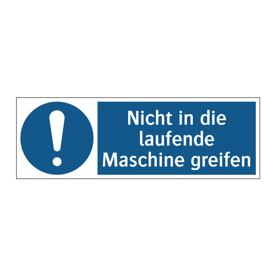 Gebotsschild mit dem Text Nicht in die laufende Maschine greifen