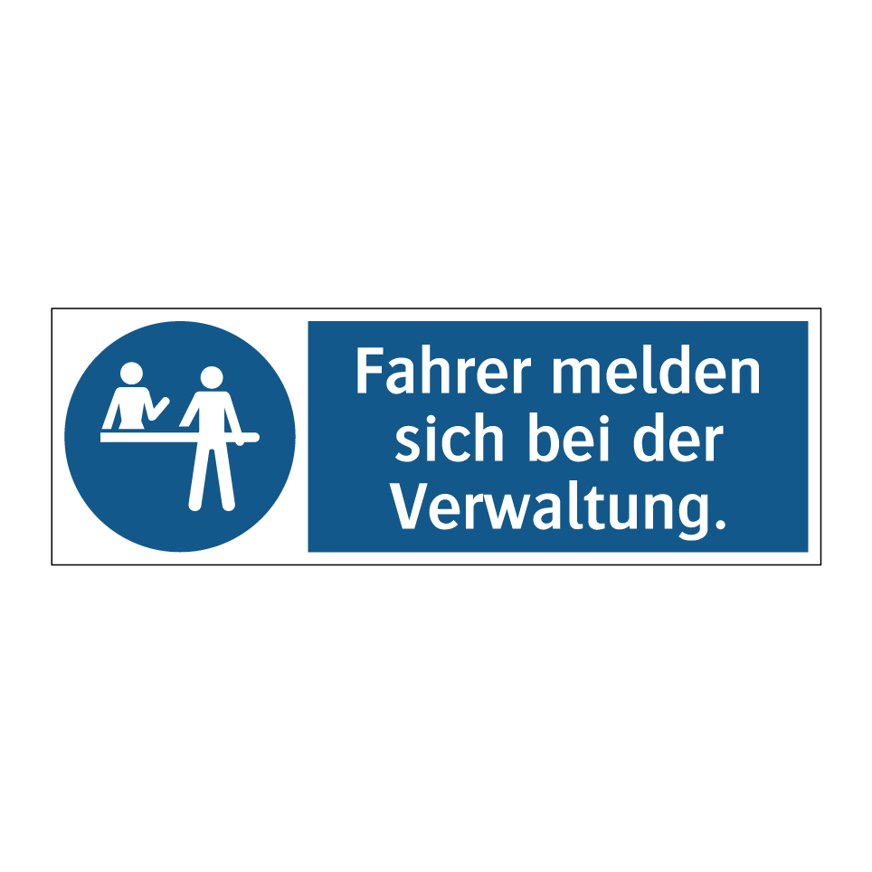Diese Gebotsschild mit blauer Hintergrundfarbe und weißer Schrift ist ideal für den Einsatz in Bereichen, in denen Fahrer sich bei der Verwaltung anmelden müssen. Sie eignet sich hervorragend für Industriegebiete, Lagerhäuser oder Firmengelände, wo klare Anweisungen für den Zugang erforderlich sind. Die deutliche Symbolik sorgt dafür, dass die Botschaft unmissverständlich ist und sofort ins Auge fällt. Platzieren Sie diese Gebotsschild an Einfahrten, Empfangsbereichen oder anderen strategischen Punkten, um sicherzustellen, dass alle Fahrer die notwendigen Schritte befolgen. Diese Beschilderung trägt zur reibungslosen Organisation und Sicherheit auf Ihrem Gelände bei.