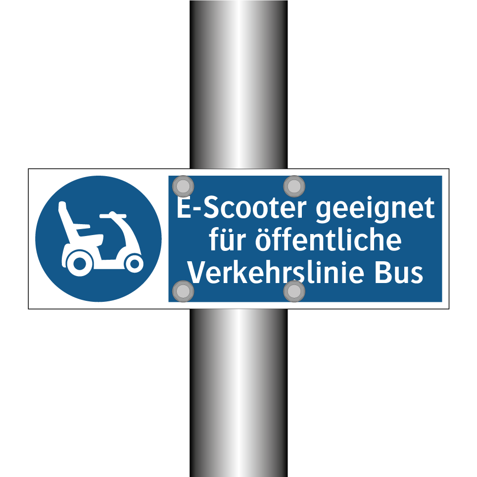 Gebotsschild mit dem Text E-Scooter geeignet für öffentliche Verkehrslinie Bus