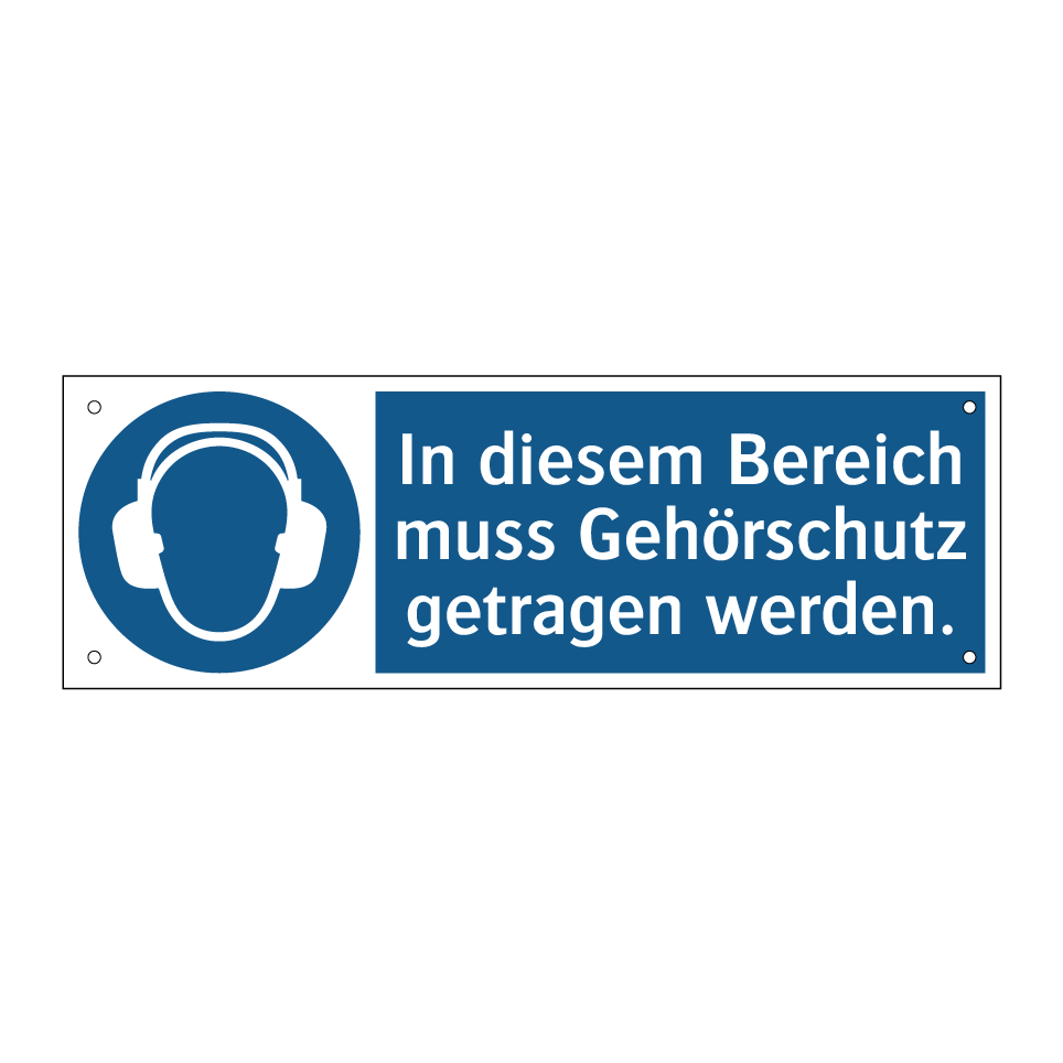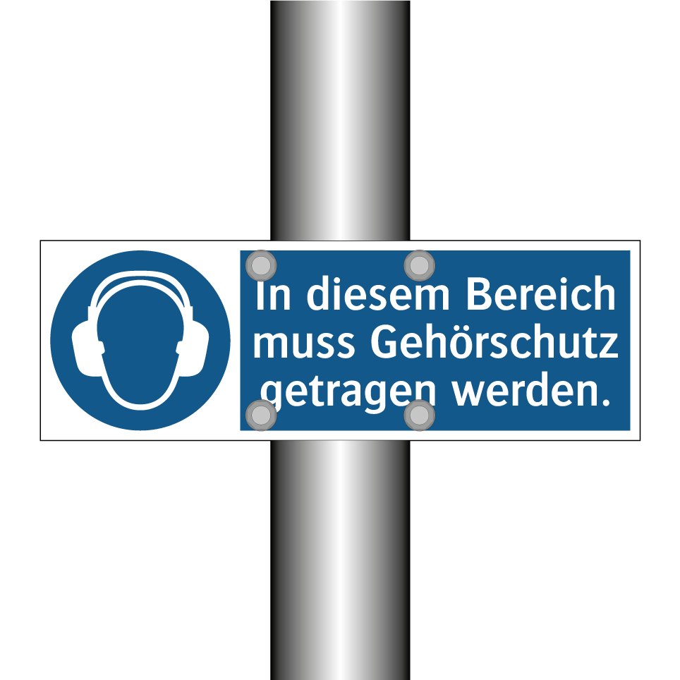 Gebotsschild mit dem Text In diesem Bereich muss Gehörschutz getragen werden.