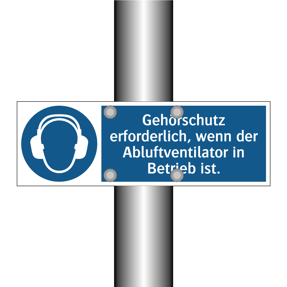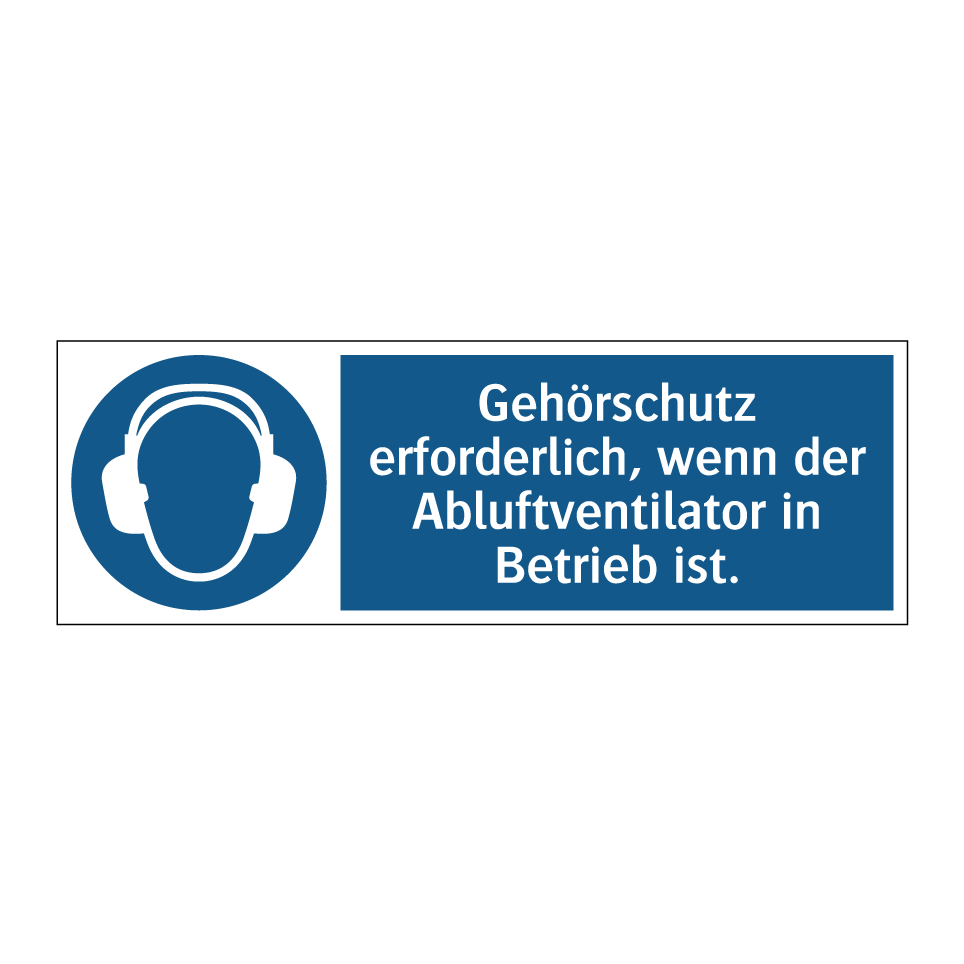 Gebotsschild mit dem Text Gehörschutz erforderlich, wenn der Abluftventilator in Betrieb ist.