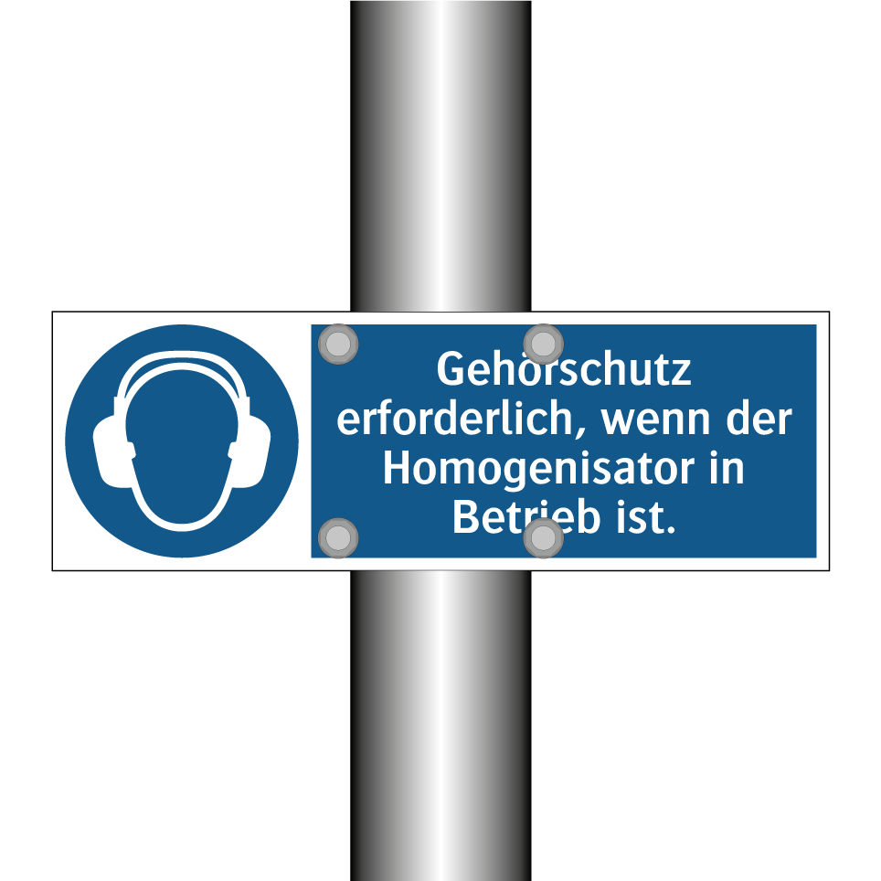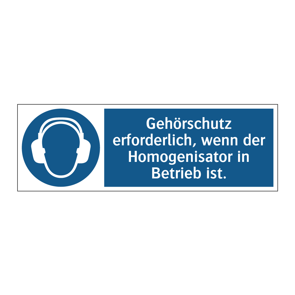 Gebotsschild mit dem Text Gehörschutz erforderlich, wenn der Homogenisator in Betrieb ist.