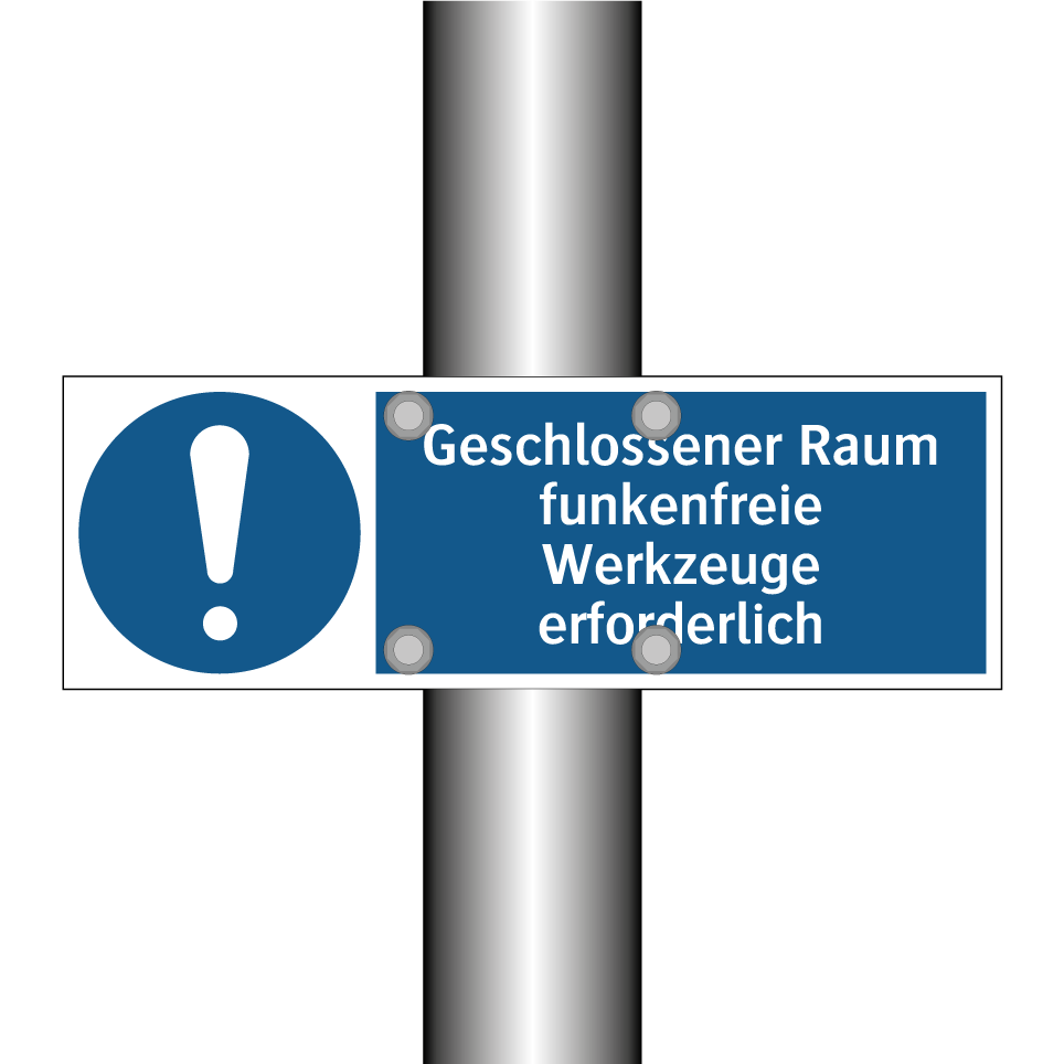 Gebotsschild mit dem Text Geschlossener Raum funkenfreie Werkzeuge erforderlich