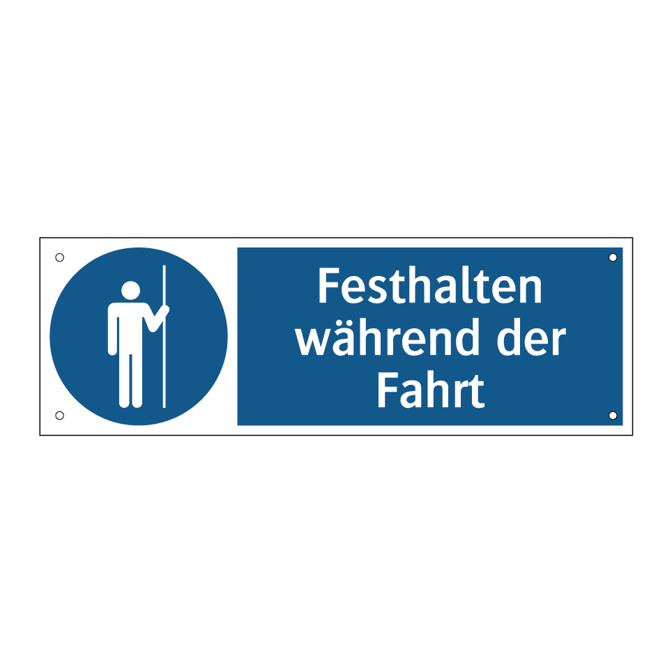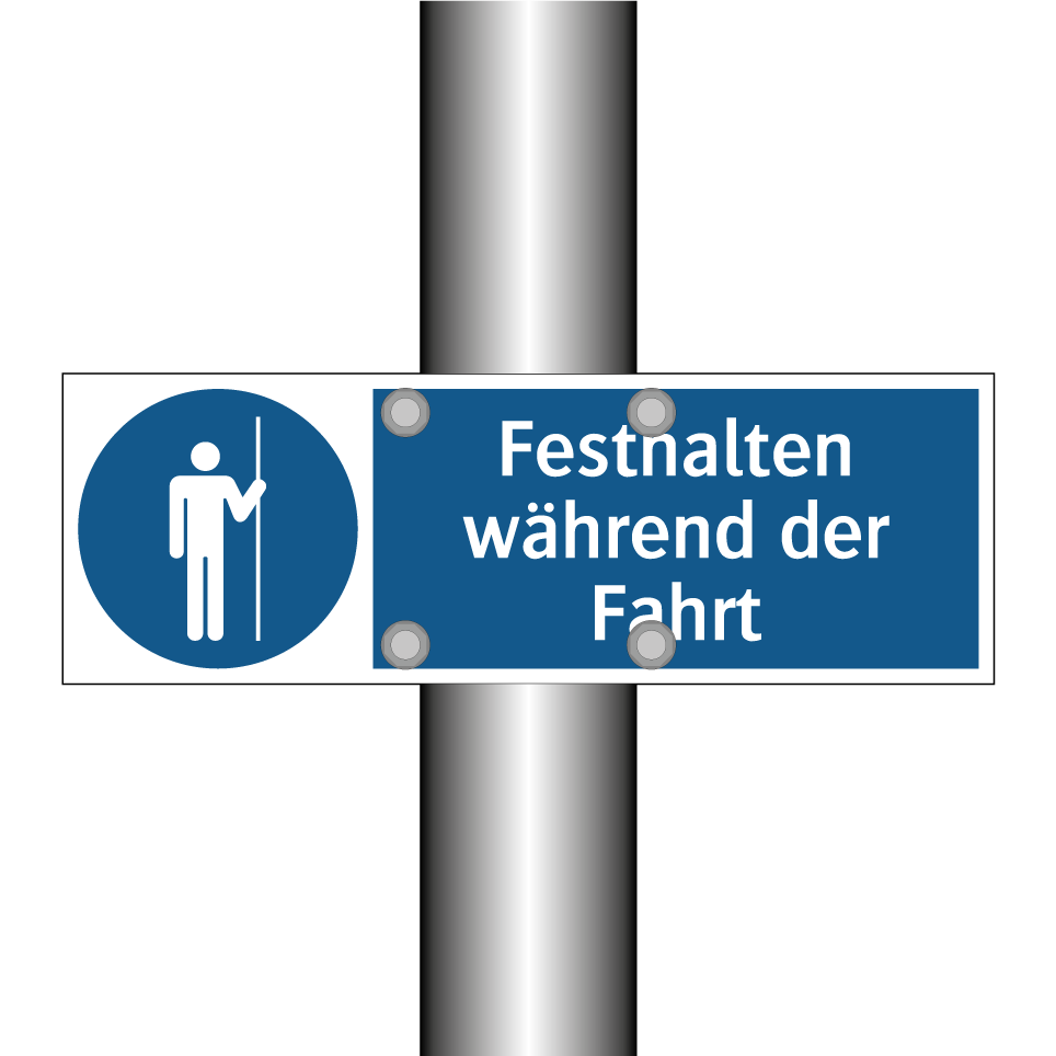 Gebotsschild mit dem Text Festhalten während der Fahrt