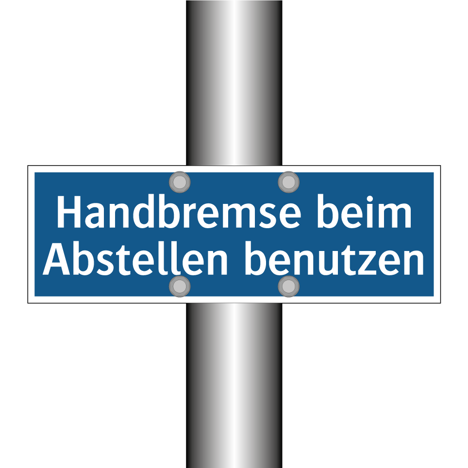 Gebotsschild mit dem Text Handbremse beim Abstellen benutzen