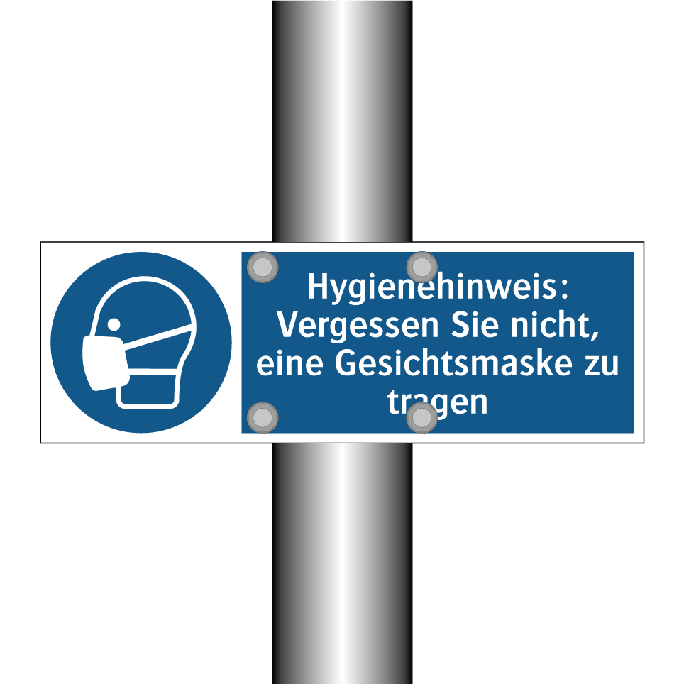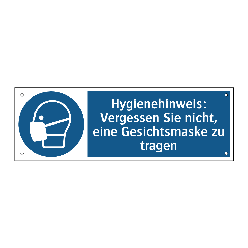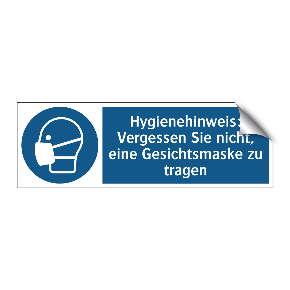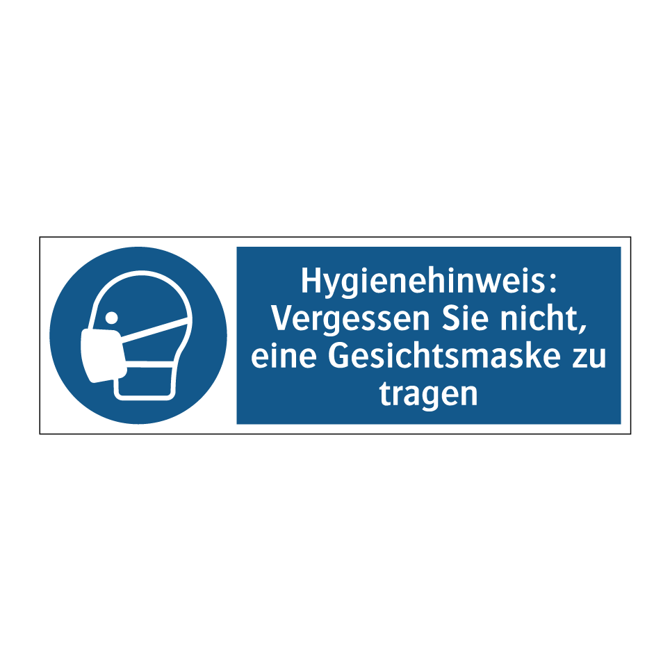 Gebotsschild mit dem Text Hygienehinweis: Vergessen Sie nicht, eine Gesichtsmaske zu tragen