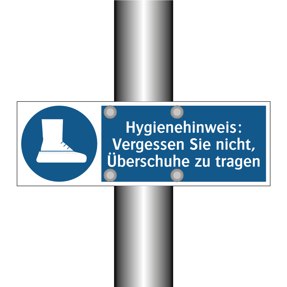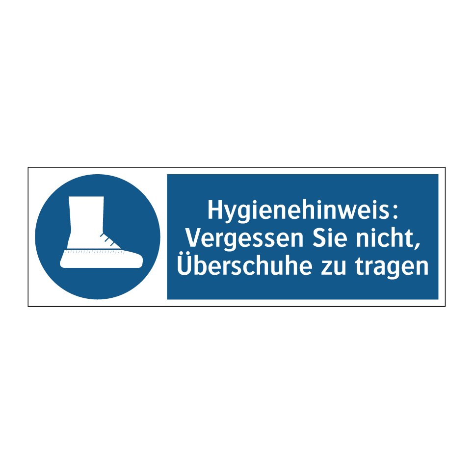Gebotsschild mit dem Text Hygienehinweis: Vergessen Sie nicht, Überschuhe zu tragen