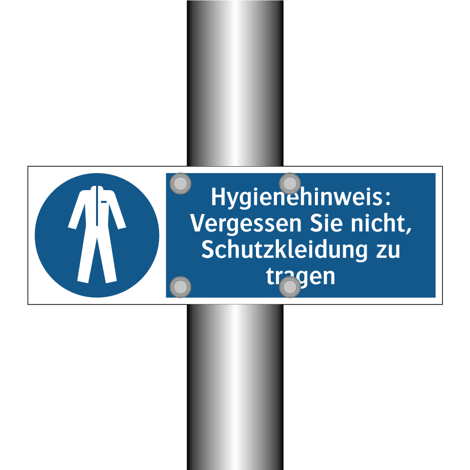 Gebotsschild mit dem Text Hygienehinweis: Vergessen Sie nicht, Schutzkleidung zu tragen