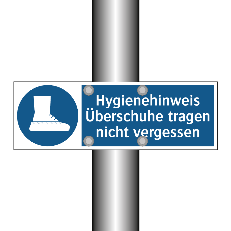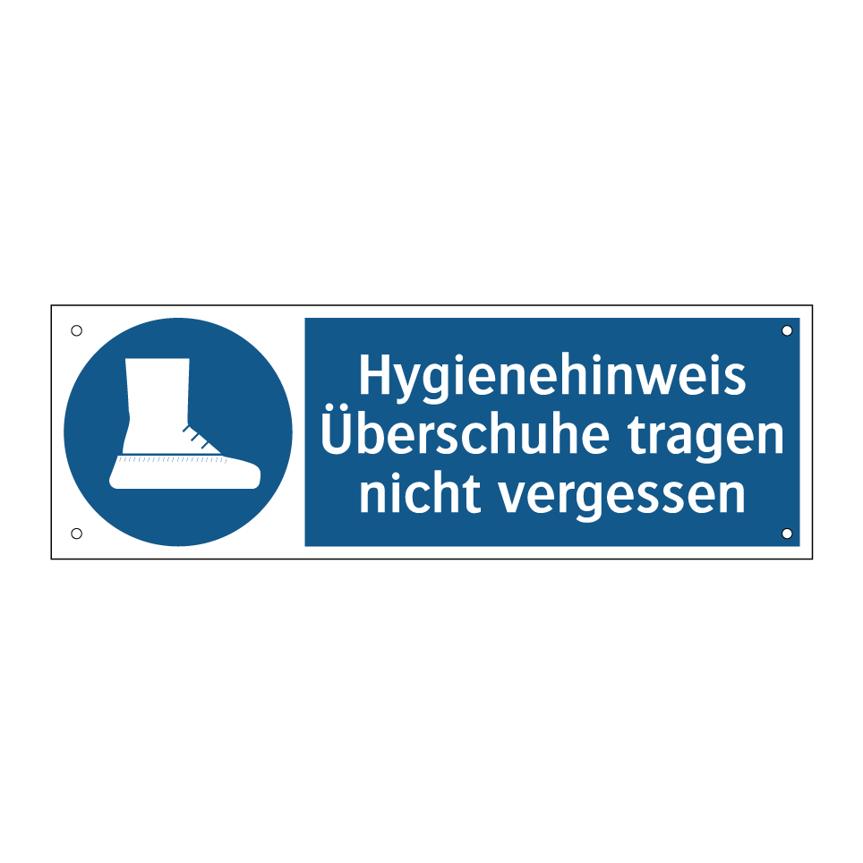 Gebotsschild mit dem Text Hygienehinweis Überschuhe tragen nicht vergessen