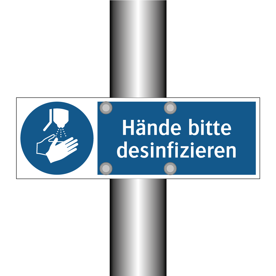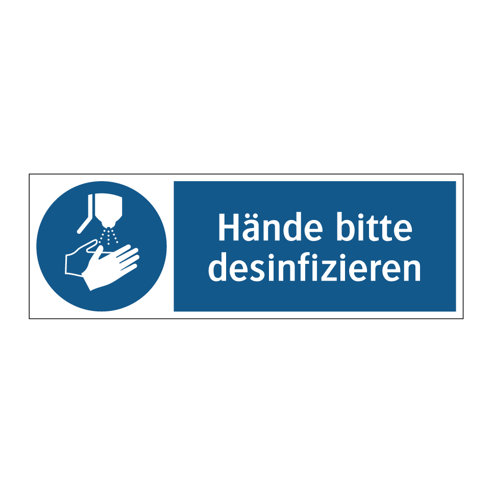 Gebotsschild mit dem Text Hände bitte desinfizieren