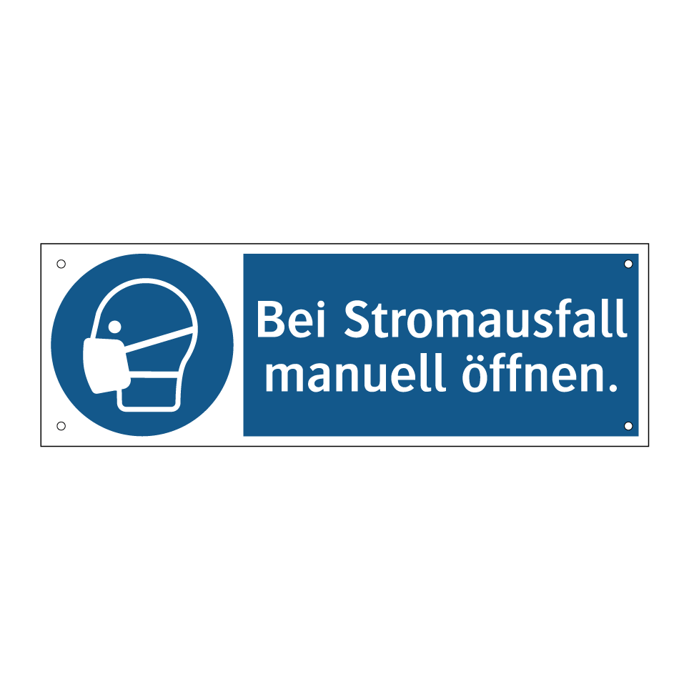 Gebotsschild mit dem Text Bei Stromausfall manuell öffnen.