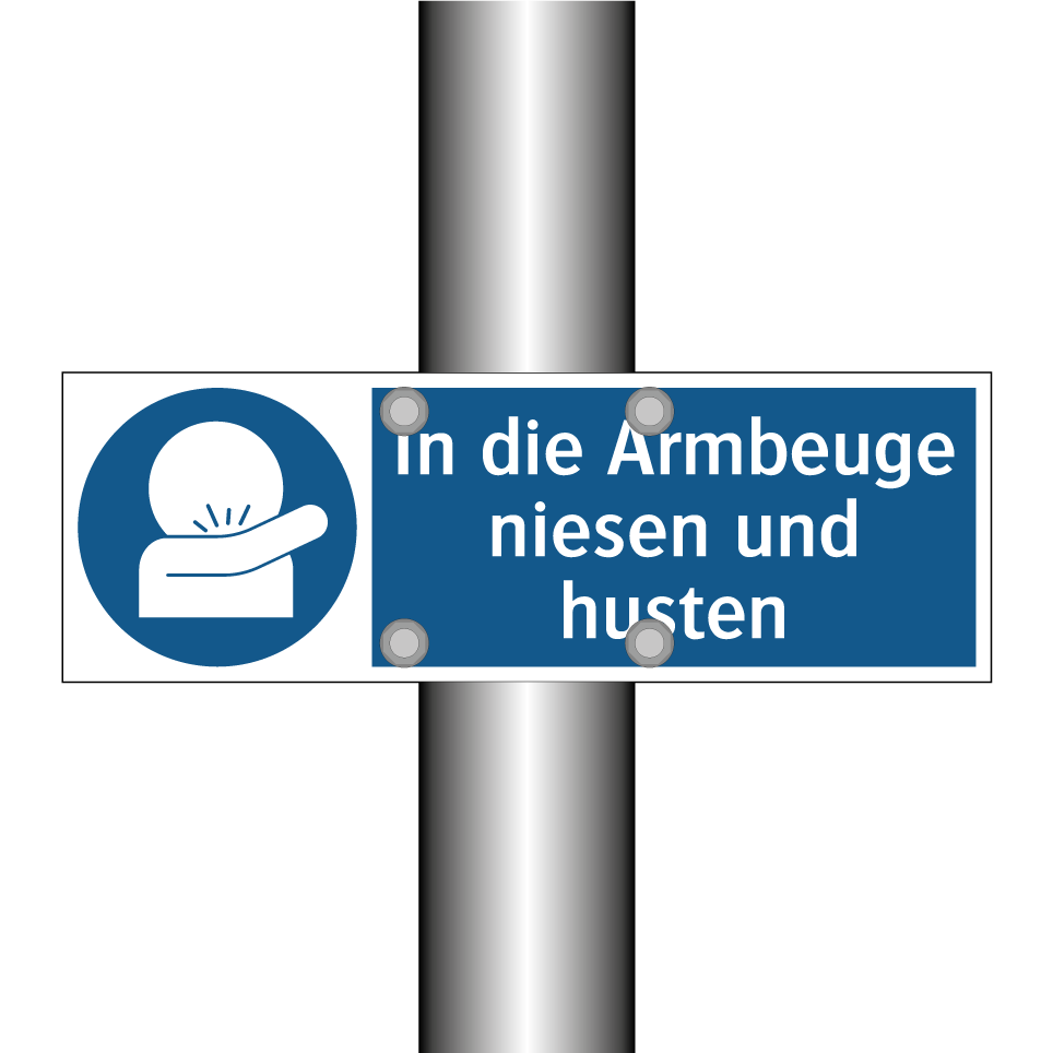 Gebotsschild mit dem Text In die Armbeuge niesen und husten