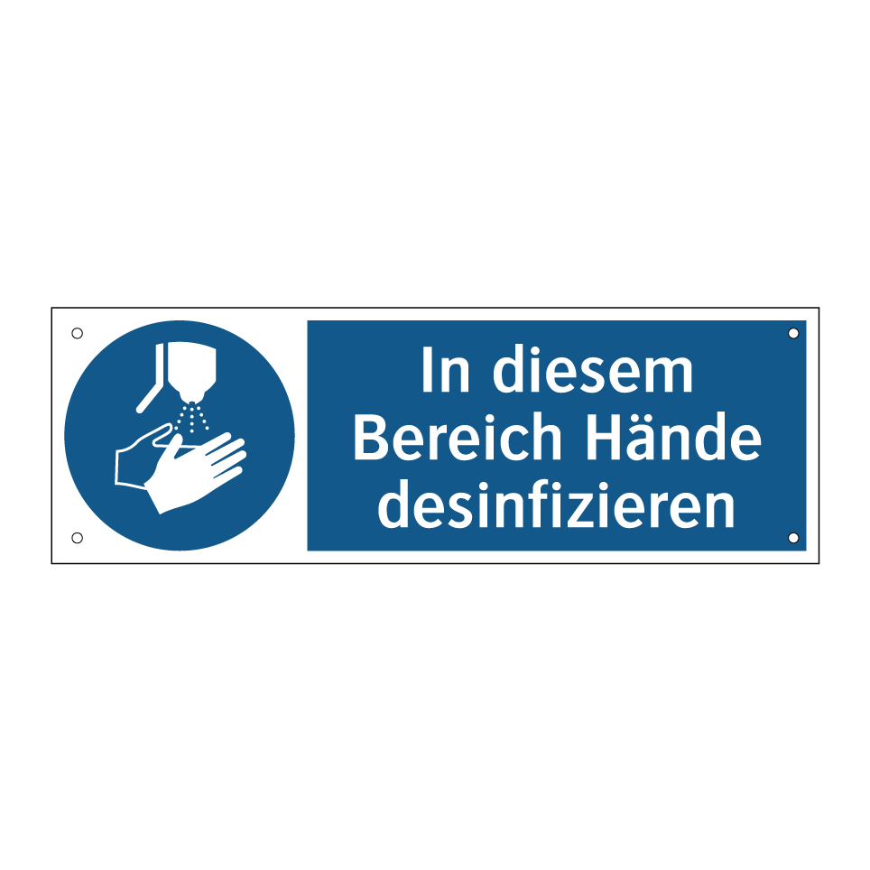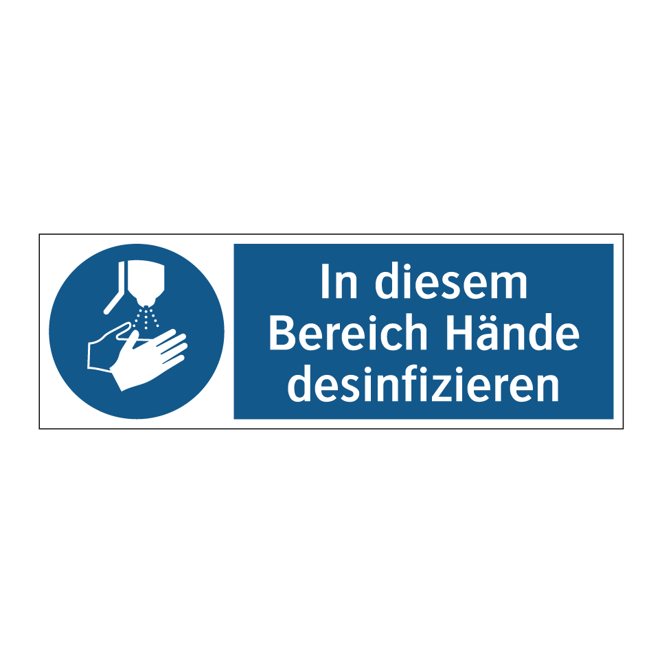 Gebotsschild mit dem Text In diesem Bereich Hände desinfizieren