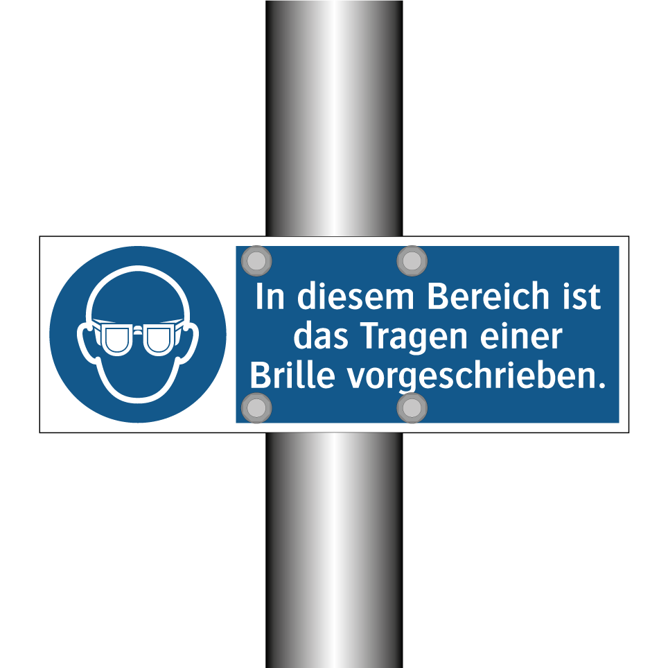 Gebotsschild mit dem Text In diesem Bereich ist das Tragen einer Brille vorgeschrieben.