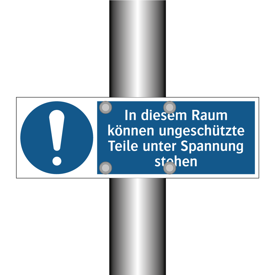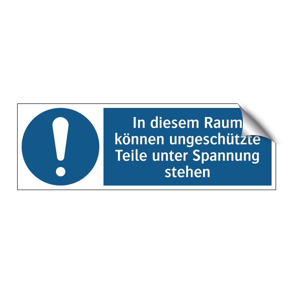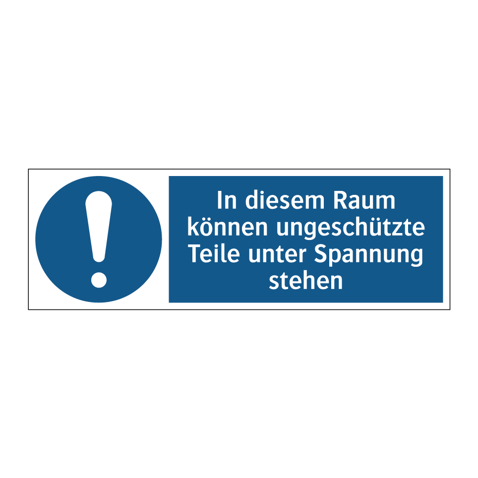 Gebotsschild mit dem Text In diesem Raum können ungeschützte Teile unter Spannung stehen