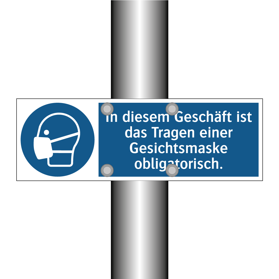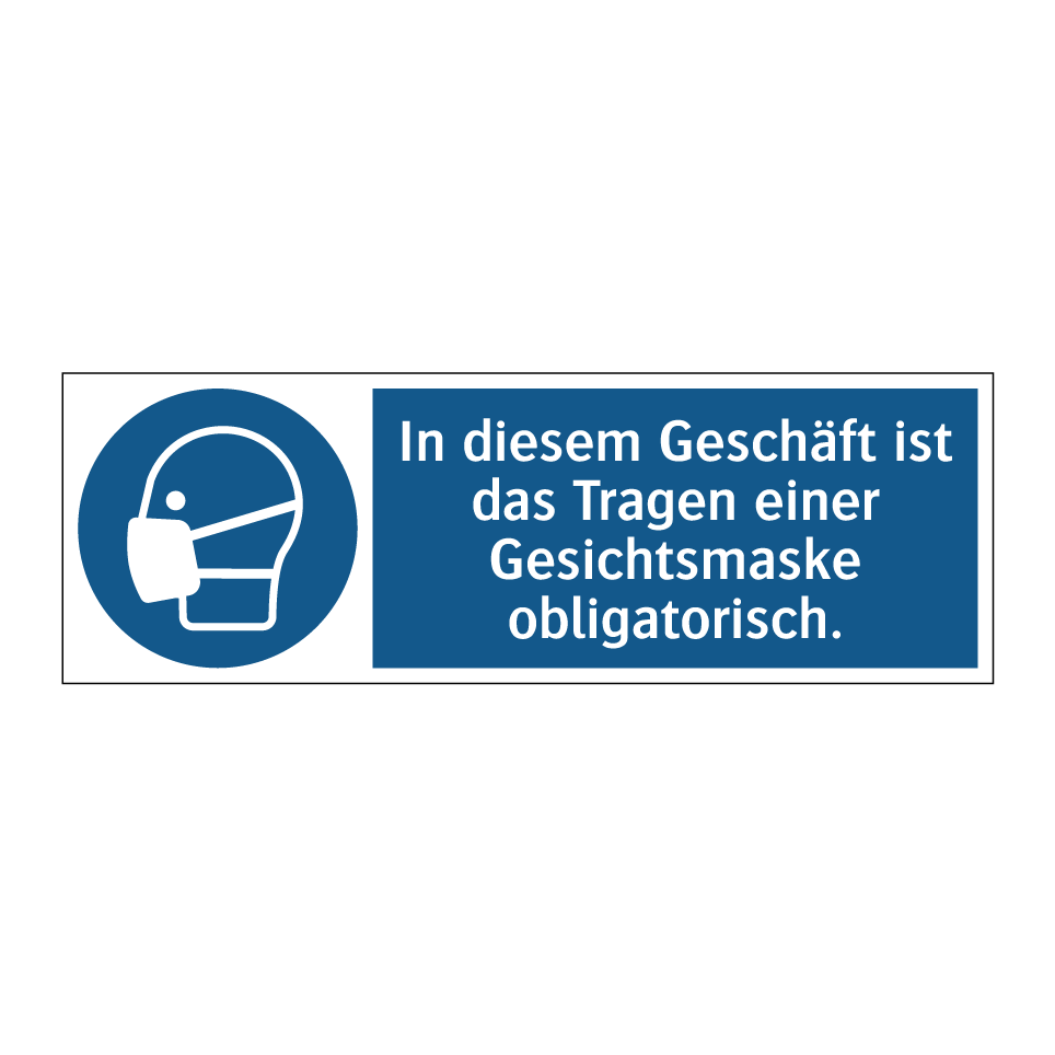 Gebotsschild mit dem Text In diesem Geschäft ist das Tragen einer Gesichtsmaske obligatorisch.