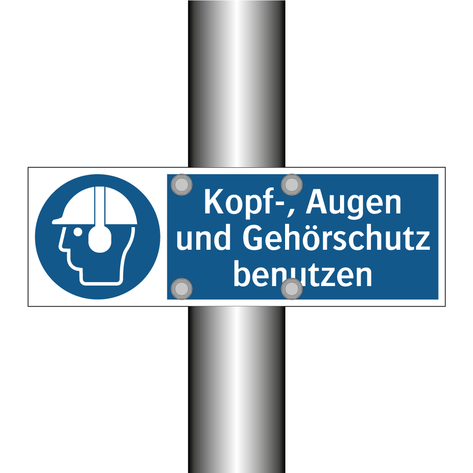 Gebotsschild mit dem Text Kopf-, Augen und Gehörschutz benutzen