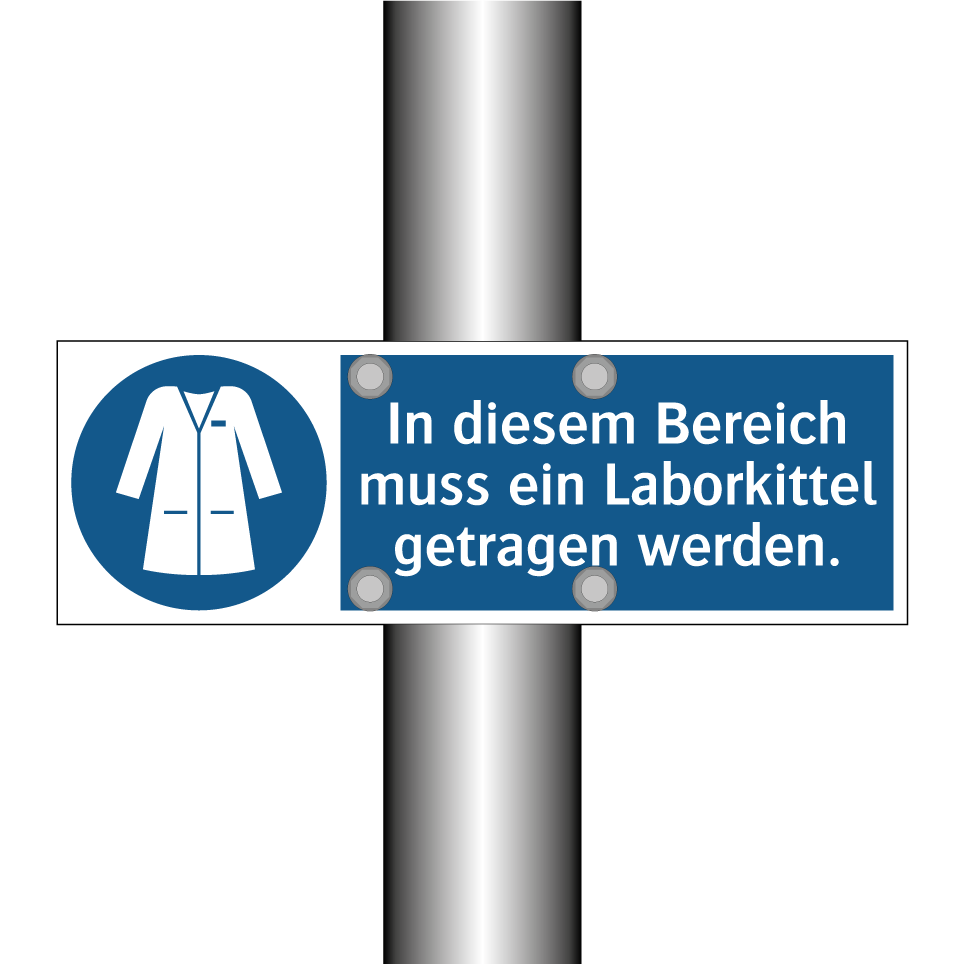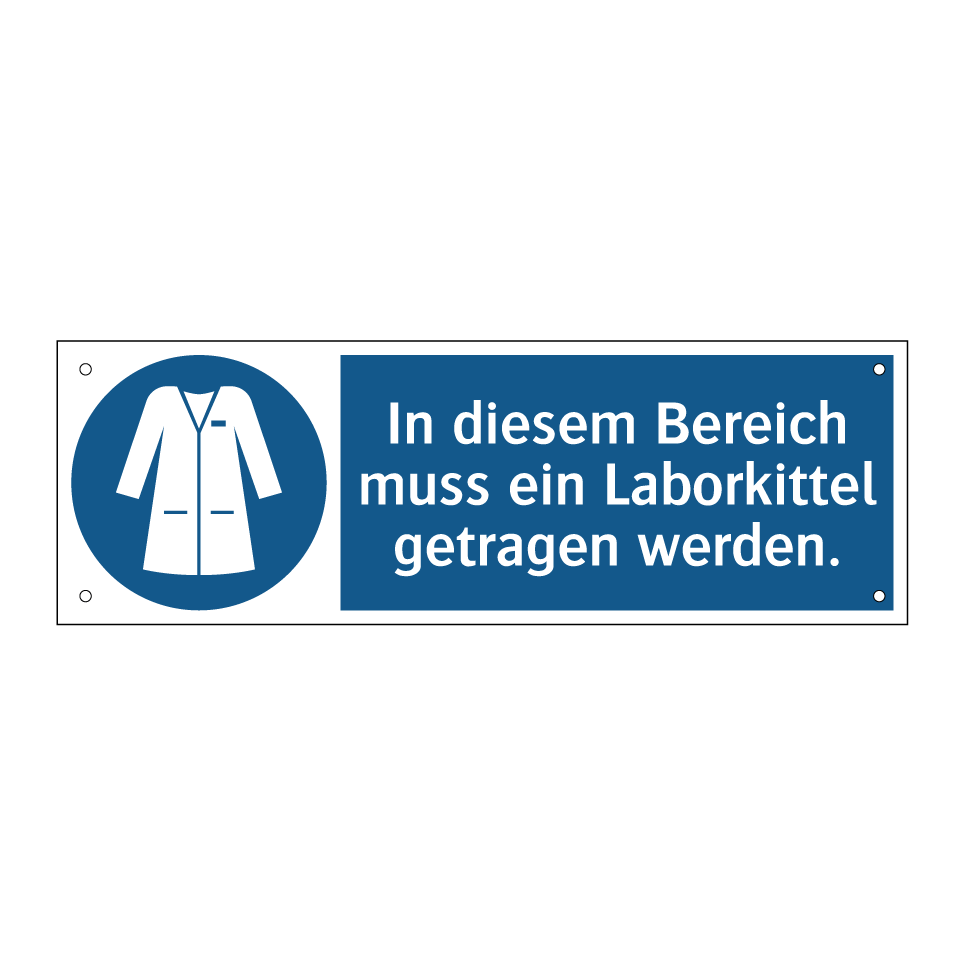 Gebotsschild mit dem Text In diesem Bereich muss ein Laborkittel getragen werden.