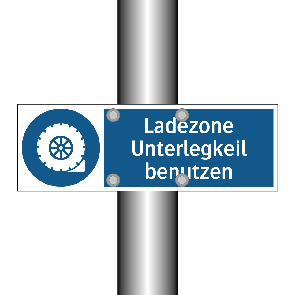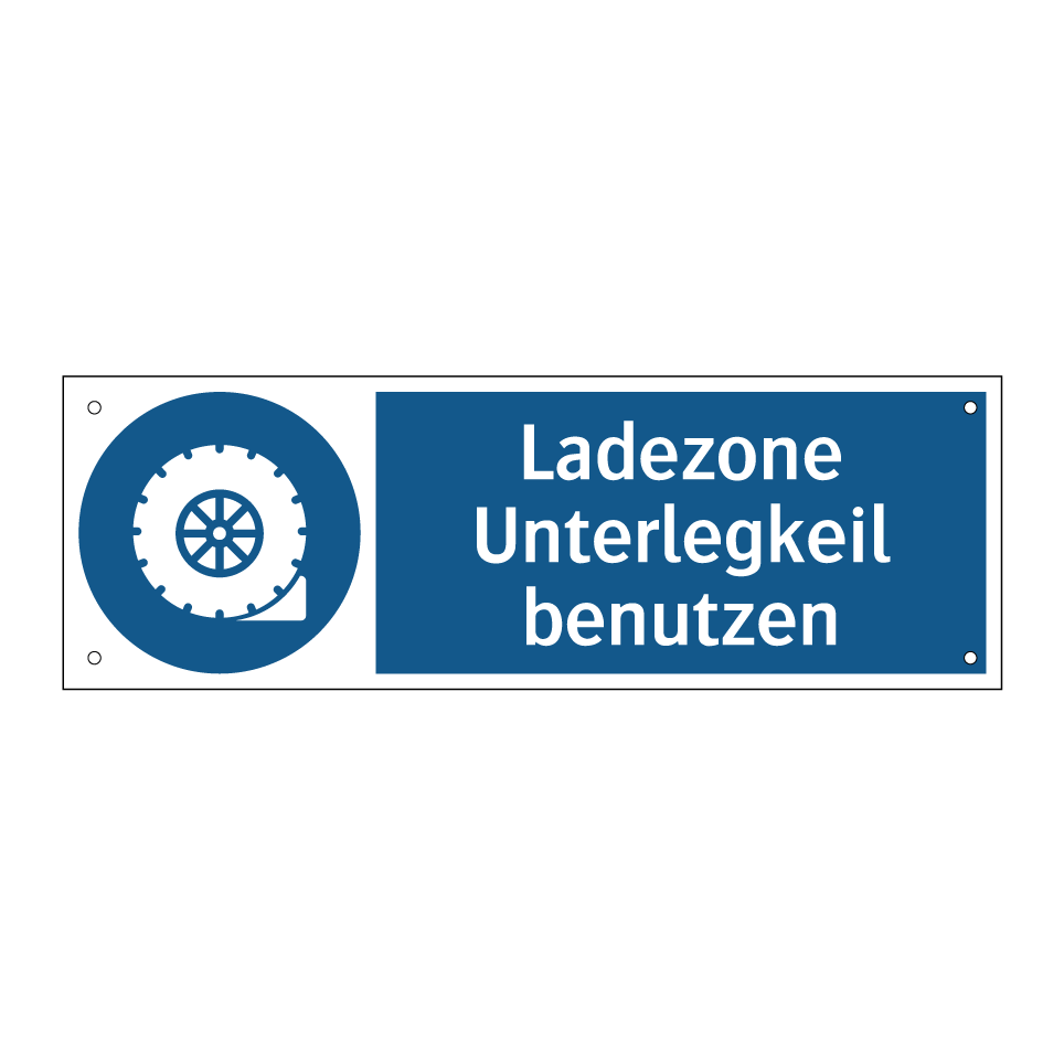 Gebotsschild mit dem Text Ladezone Unterlegkeil benutzen