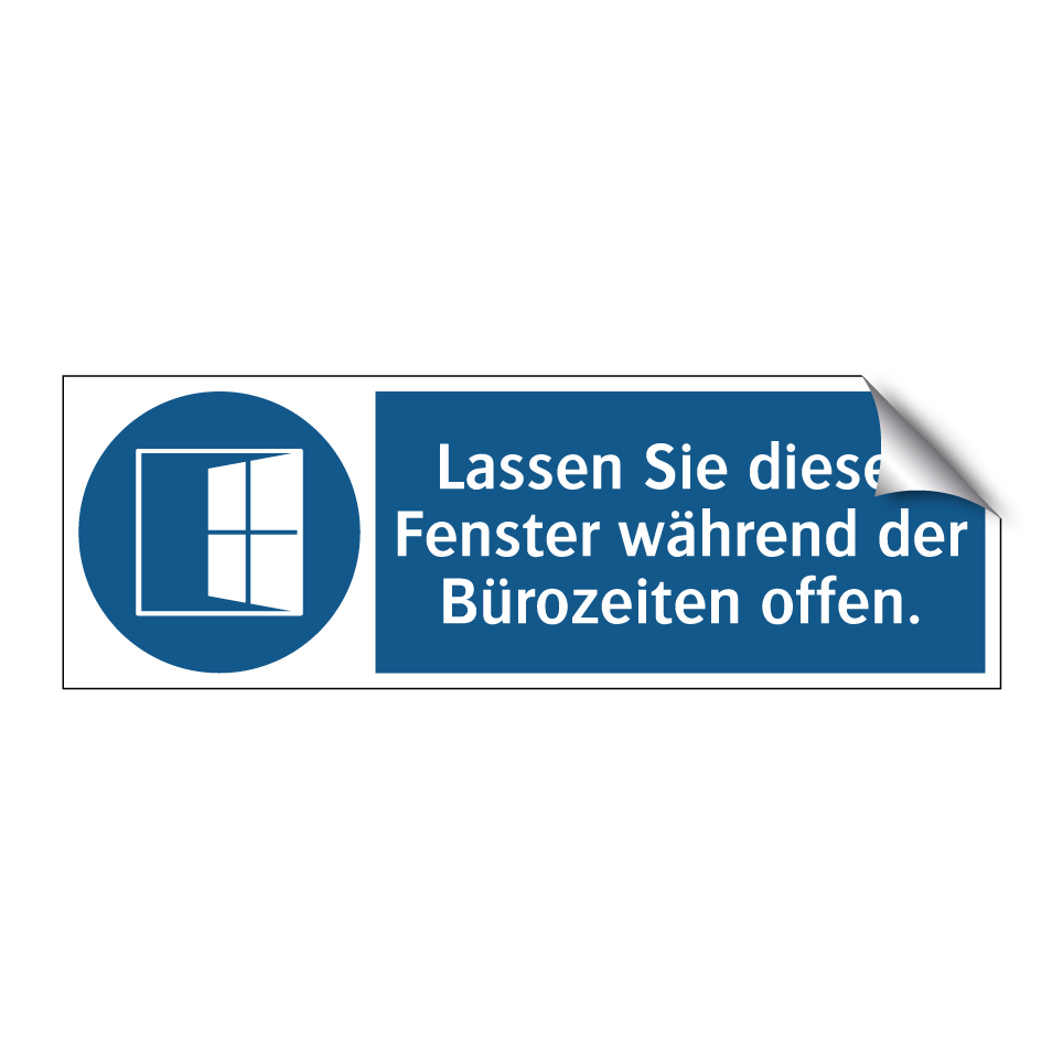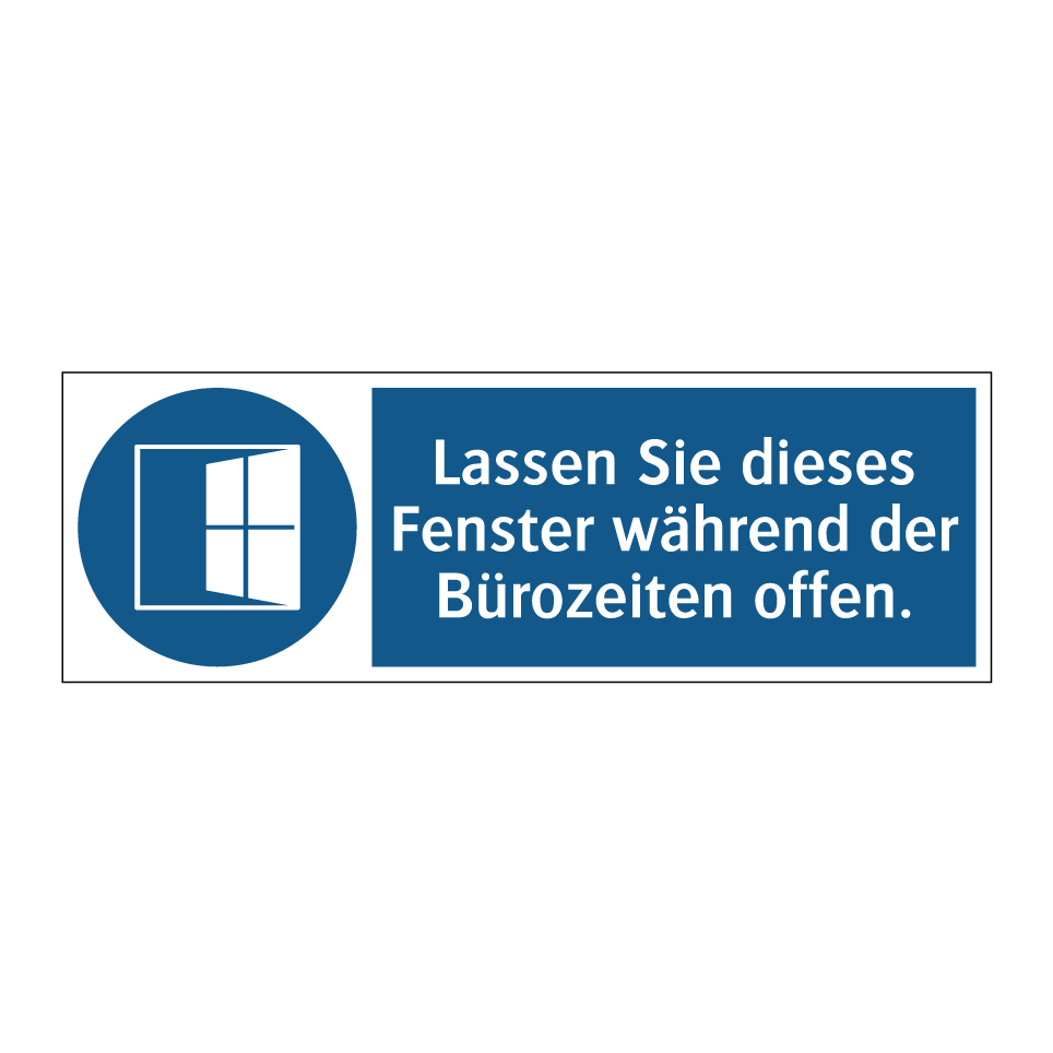 Gebotsschild mit dem Text Lassen Sie dieses Fenster während der Bürozeiten offen.