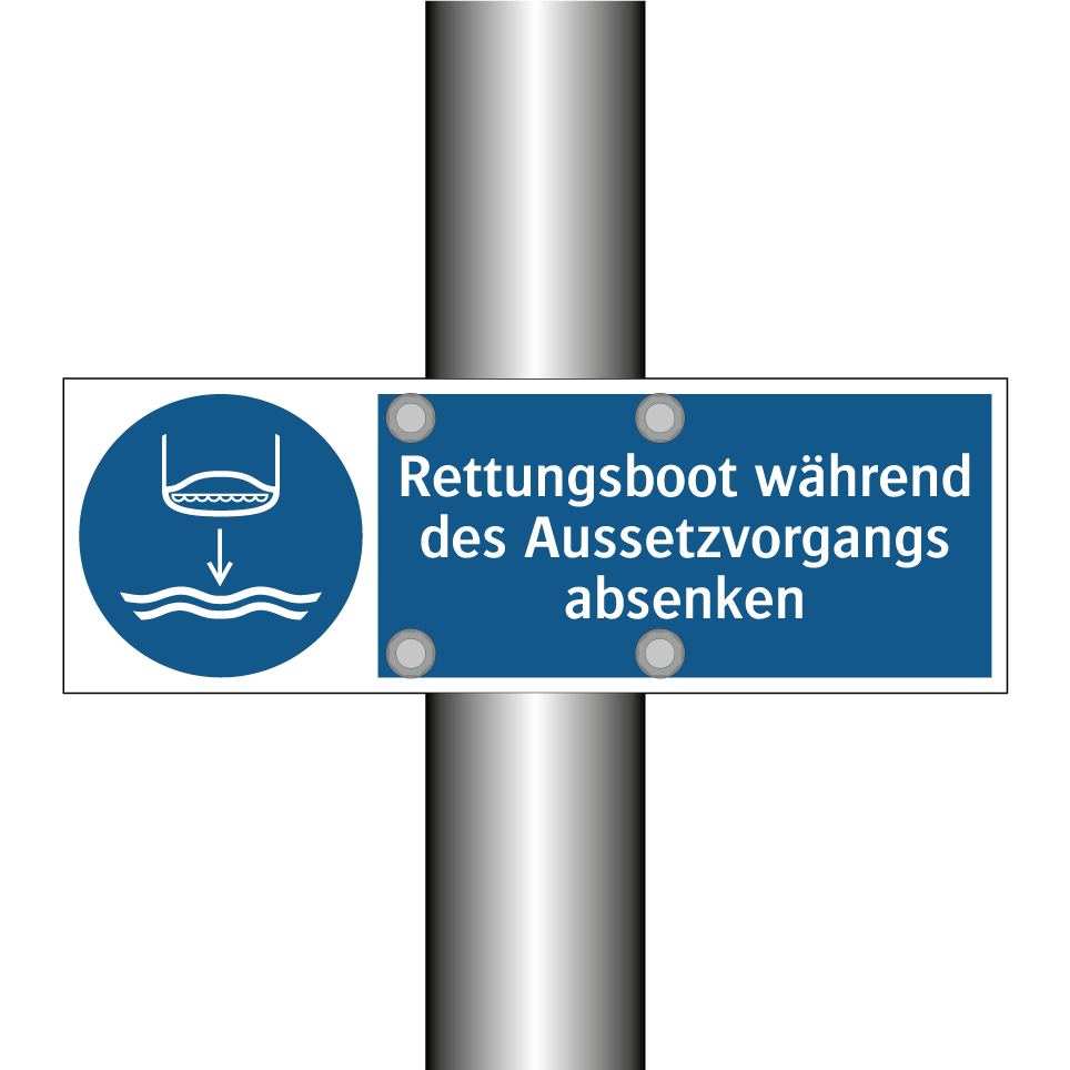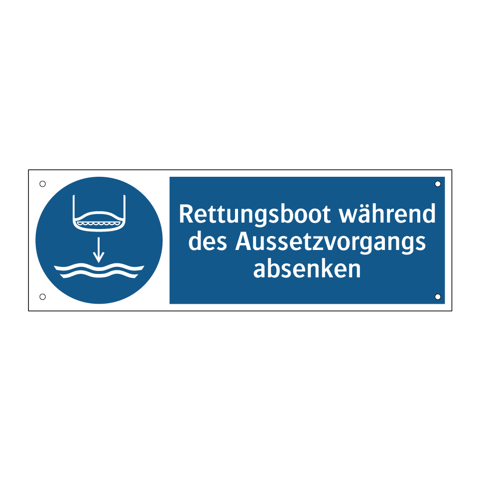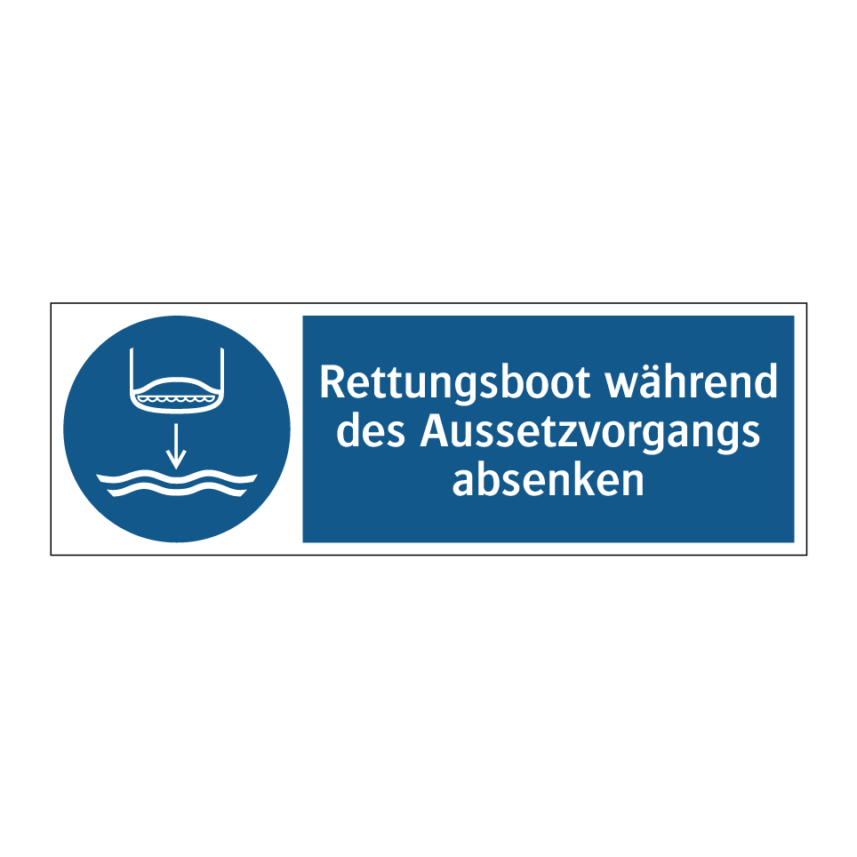 Gebotsschild mit dem Text Rettungsboot während des Aussetzvorgangs absenken