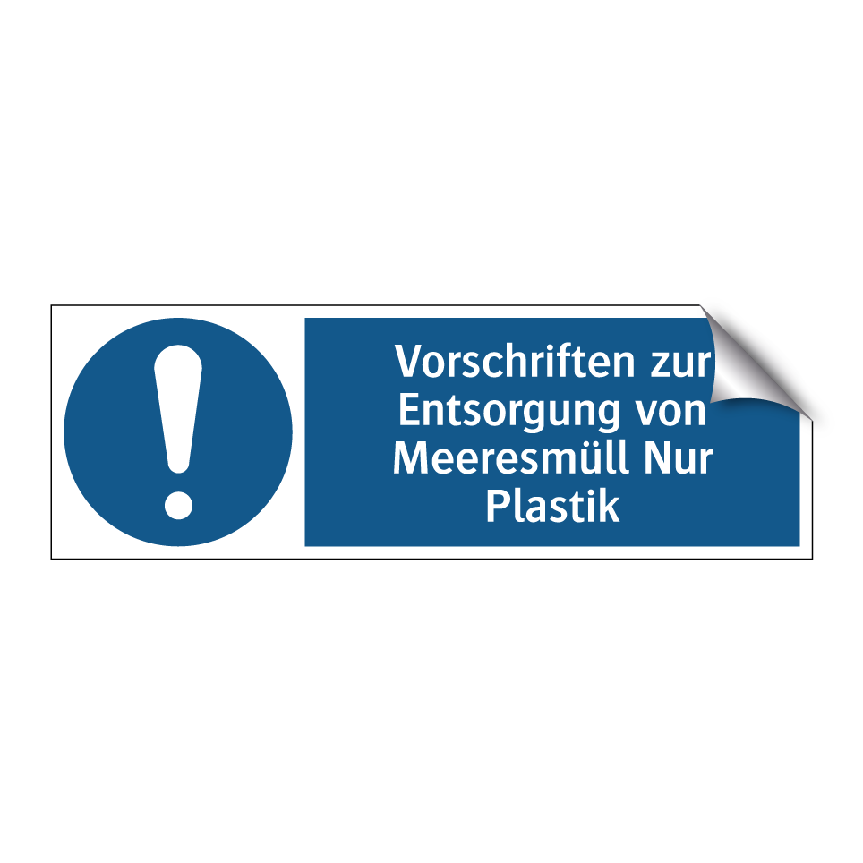 Gebotsschild mit dem Text Vorschriften zur Entsorgung von Meeresmüll Nur Plastik