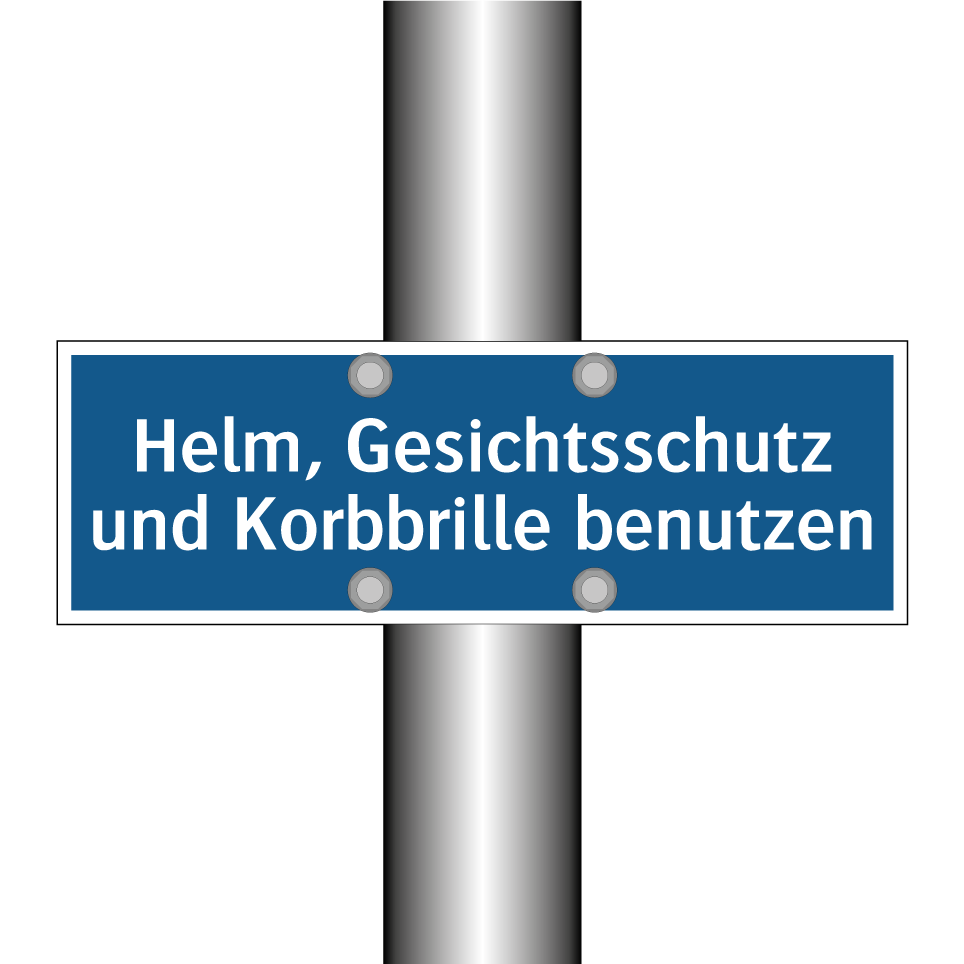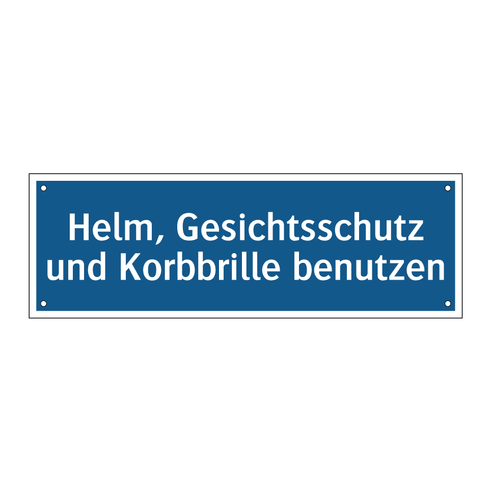 Gebotsschild mit dem Text Helm, Gesichtsschutz und Korbbrille benutzen