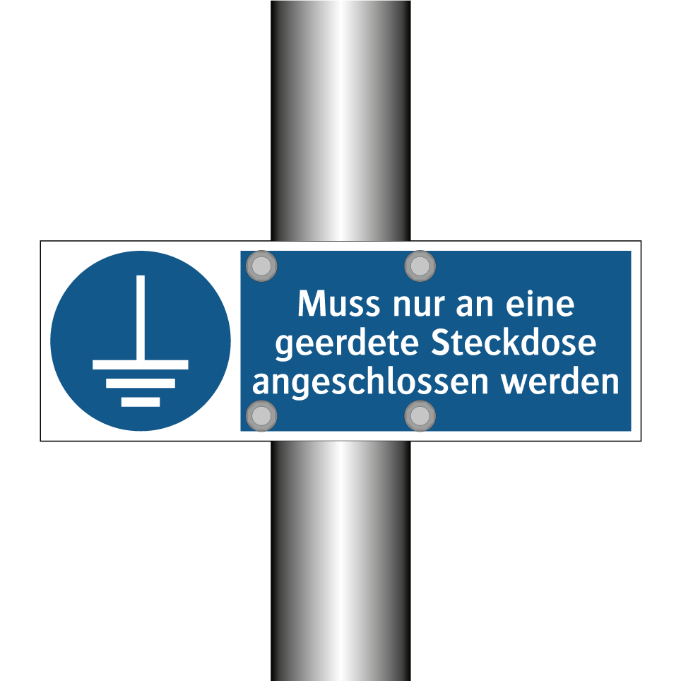 Gebotsschild mit dem Text Muss nur an eine geerdete Steckdose angeschlossen werden
