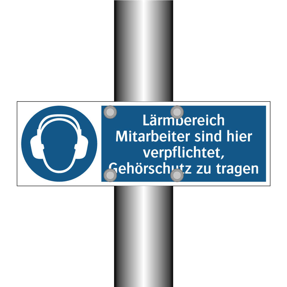 Gebotsschild mit dem Text Lärmbereich Mitarbeiter sind hier verpflichtet, Gehörschutz zu tragen