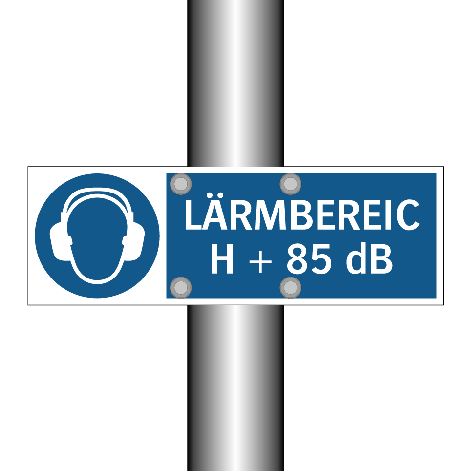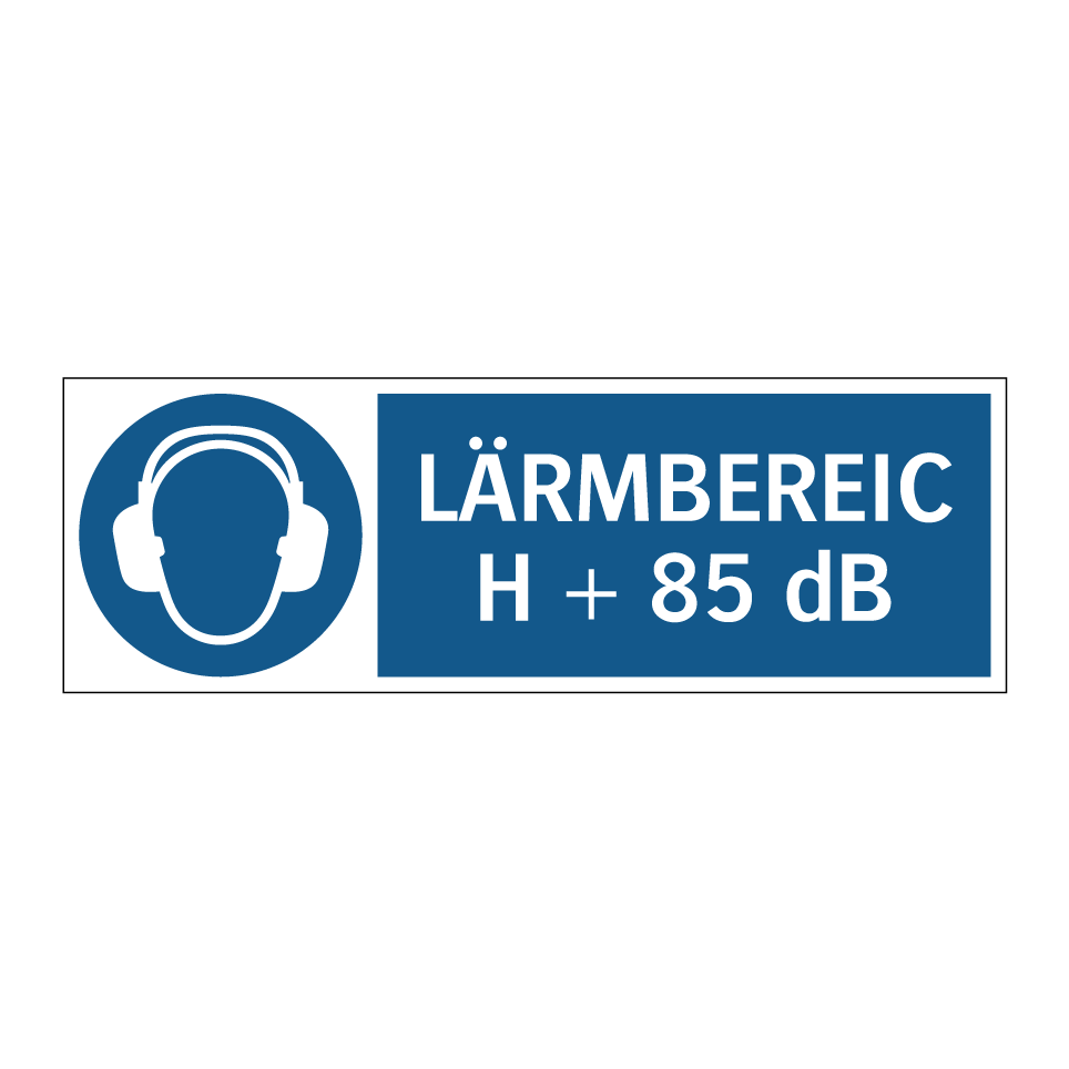 Gebotsschild mit dem Text LÄRMBEREICH + 85 dB