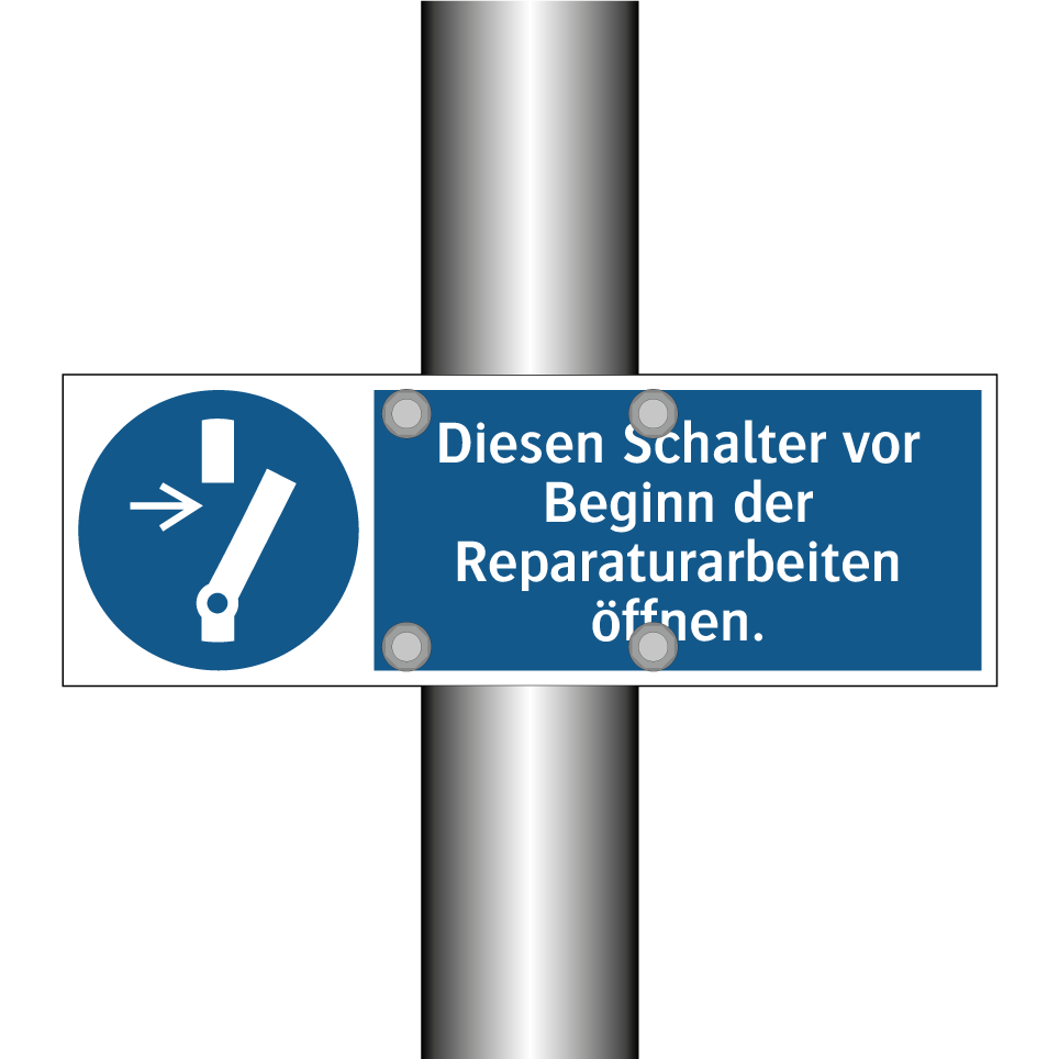 Gebotsschild mit dem Text Diesen Schalter vor Beginn der Reparaturarbeiten öffnen.