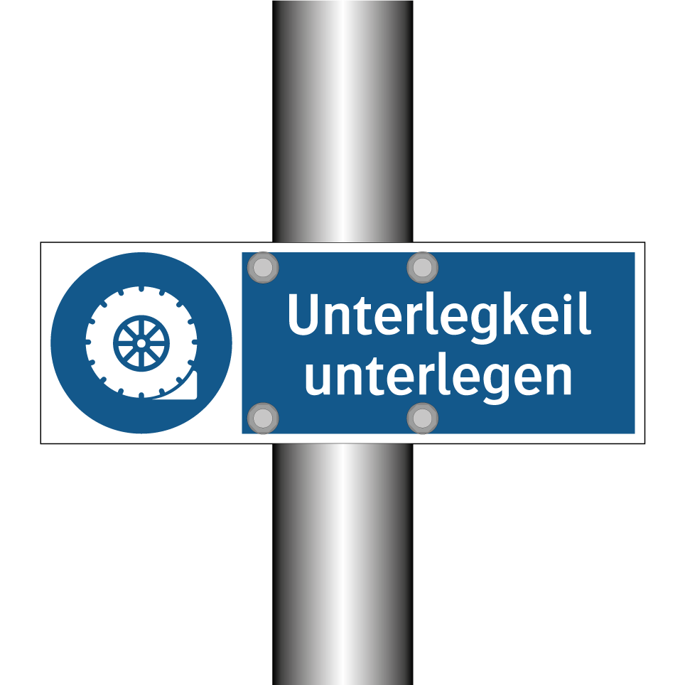 Gebotsschild mit dem Text Unterlegkeil unterlegen