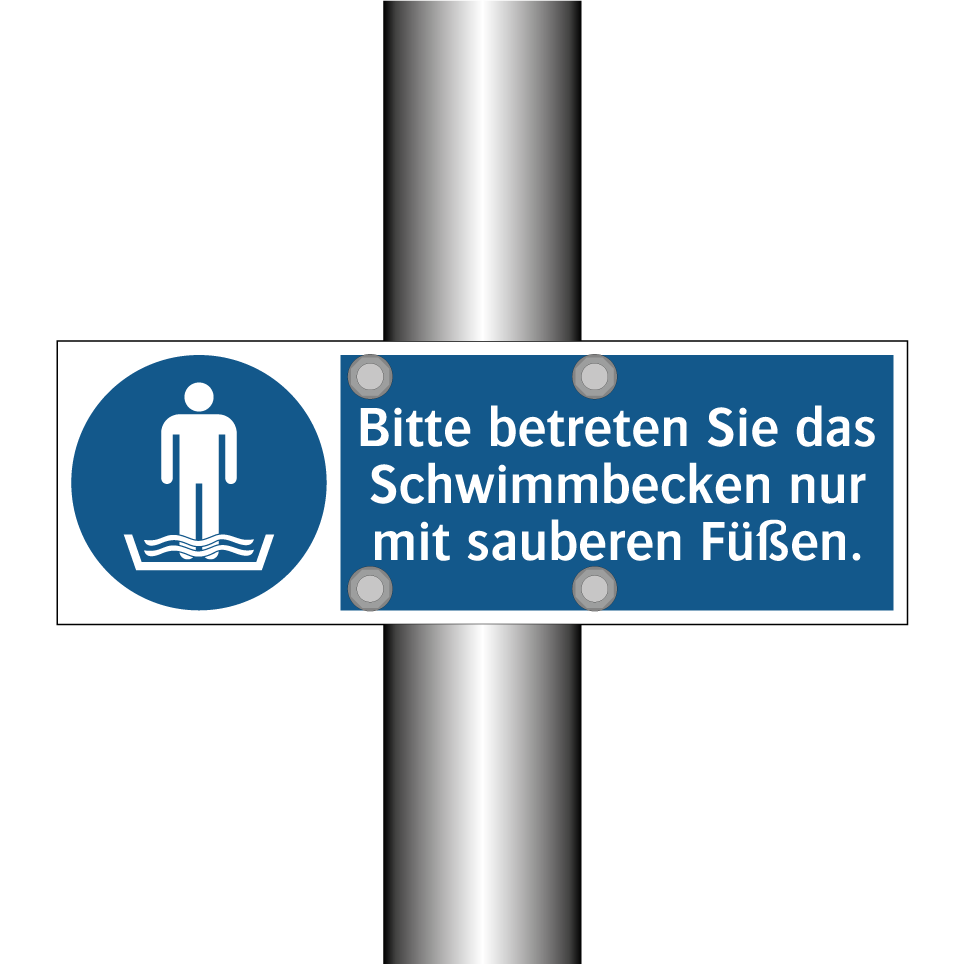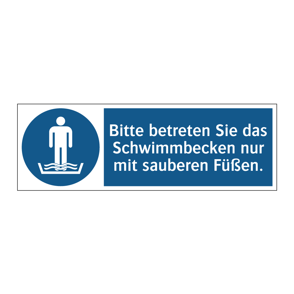 Gebotsschild mit dem Text Bitte betreten Sie das Schwimmbecken nur mit sauberen Füßen.