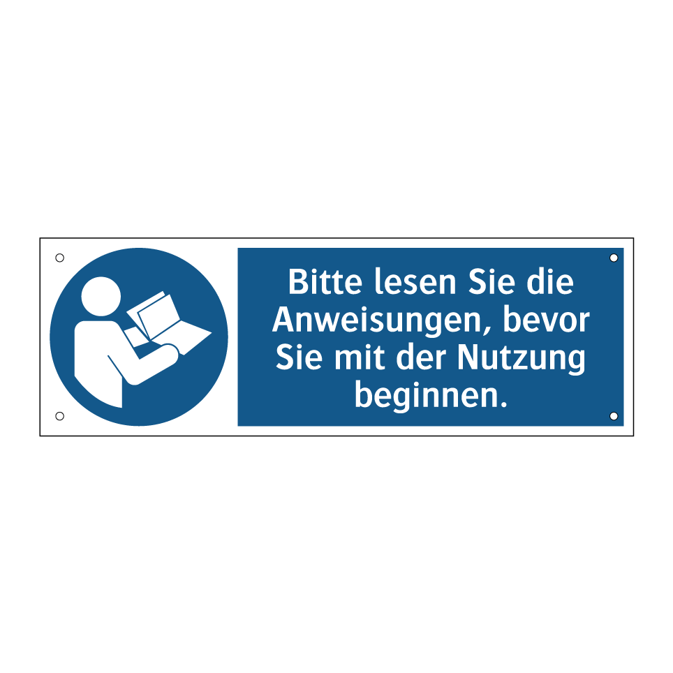 Gebotsschild mit dem Text Bitte lesen Sie die Anweisungen, bevor Sie mit der Nutzung beginnen.