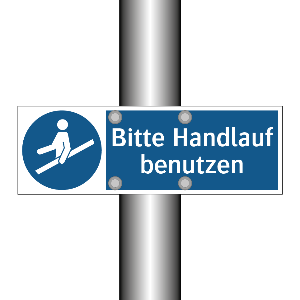 Gebotsschild mit dem Text Bitte Handlauf benutzen